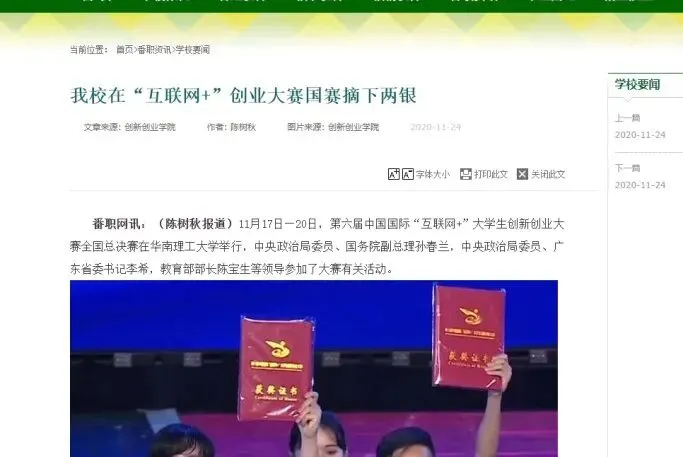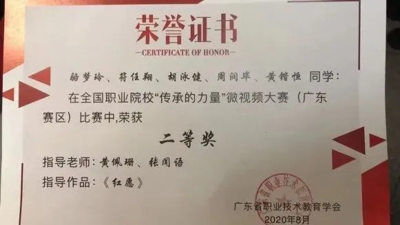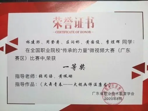 其中在2020年8月全国职业院校“传承的力量”微视频大赛(广东赛区)中,学院学生作品分别荣获一等奖与二等奖。