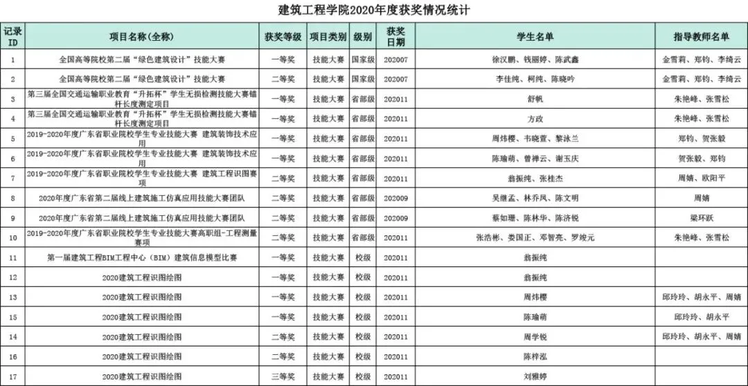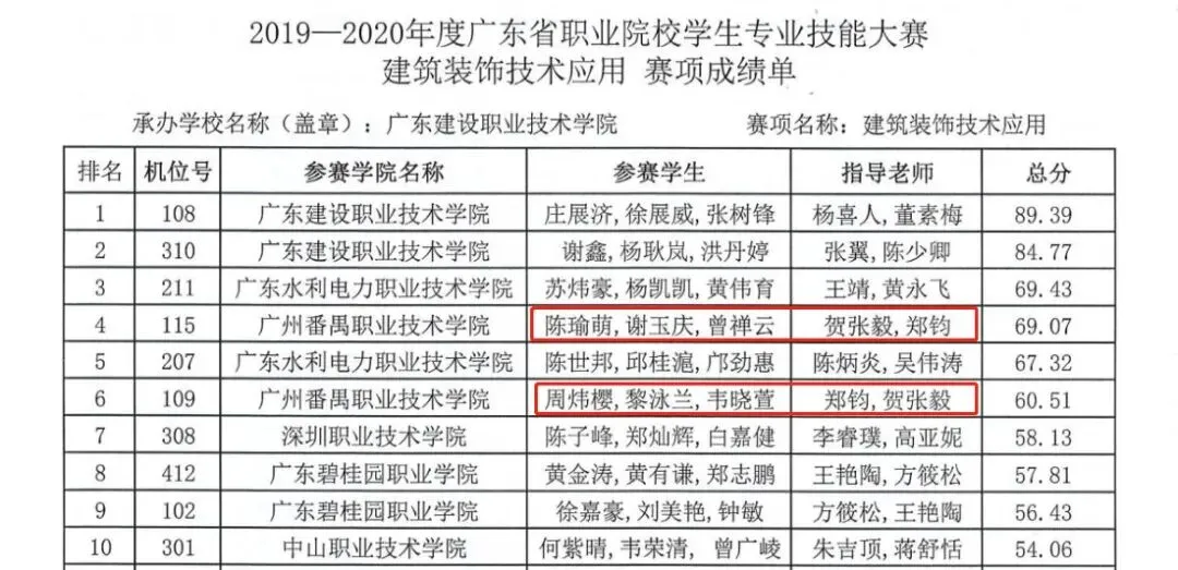 在2019-2020年度广东省职业院校学生专业技能大赛建筑装饰技术应用项目中,两支学院队伍在郑钧、贺张毅老师的指导下斩获一等奖。