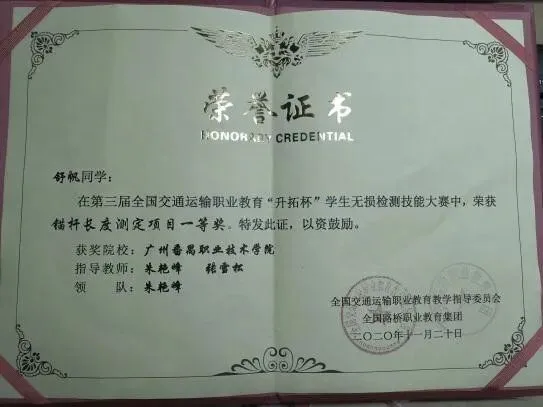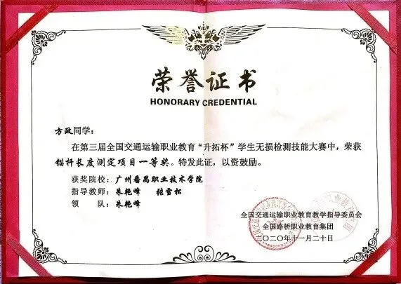 2020年11月,在第三届全国交通运输职业教育“升拓杯”学生无损检测技能大赛锚杆长度测定项目中,由朱艳峰与张雪松老师指导的两位学生荣获一等奖;