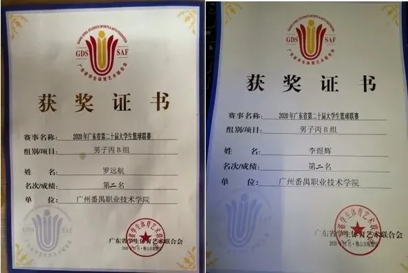 学生李煜辉、罗远航代表学校参加2020年广东省第二十届大学生篮球联赛在男子丙b组获得团队第二名。