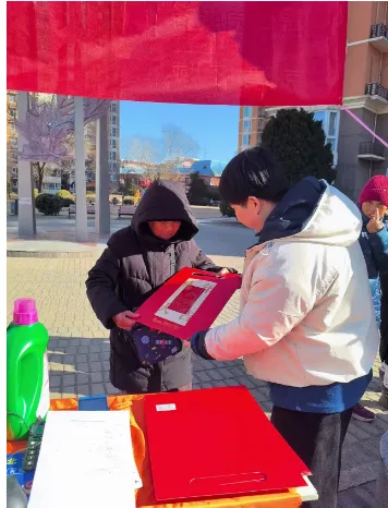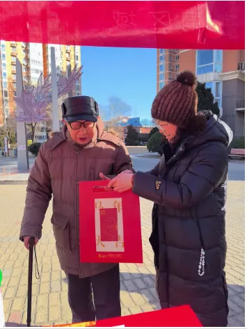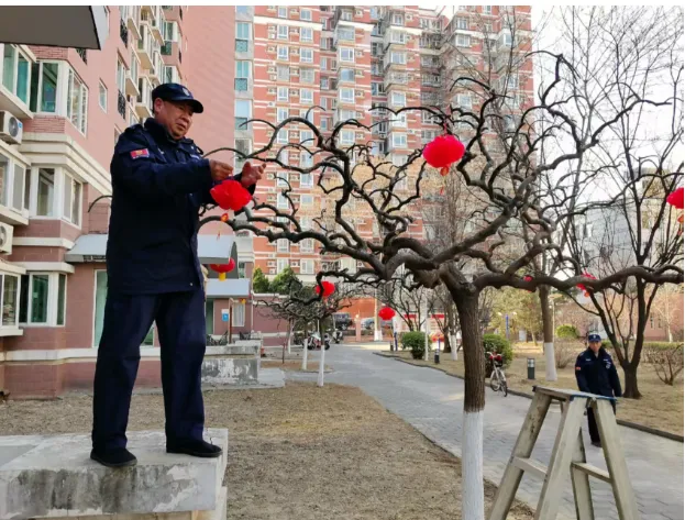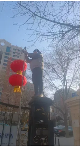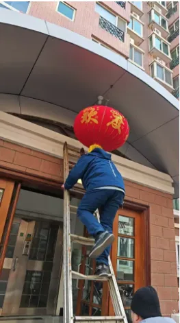 8、迎新年,物业组织给业主们送春联活动,为营造园区气氛各部门对小区贴春联,挂灯笼,接彩灯等等