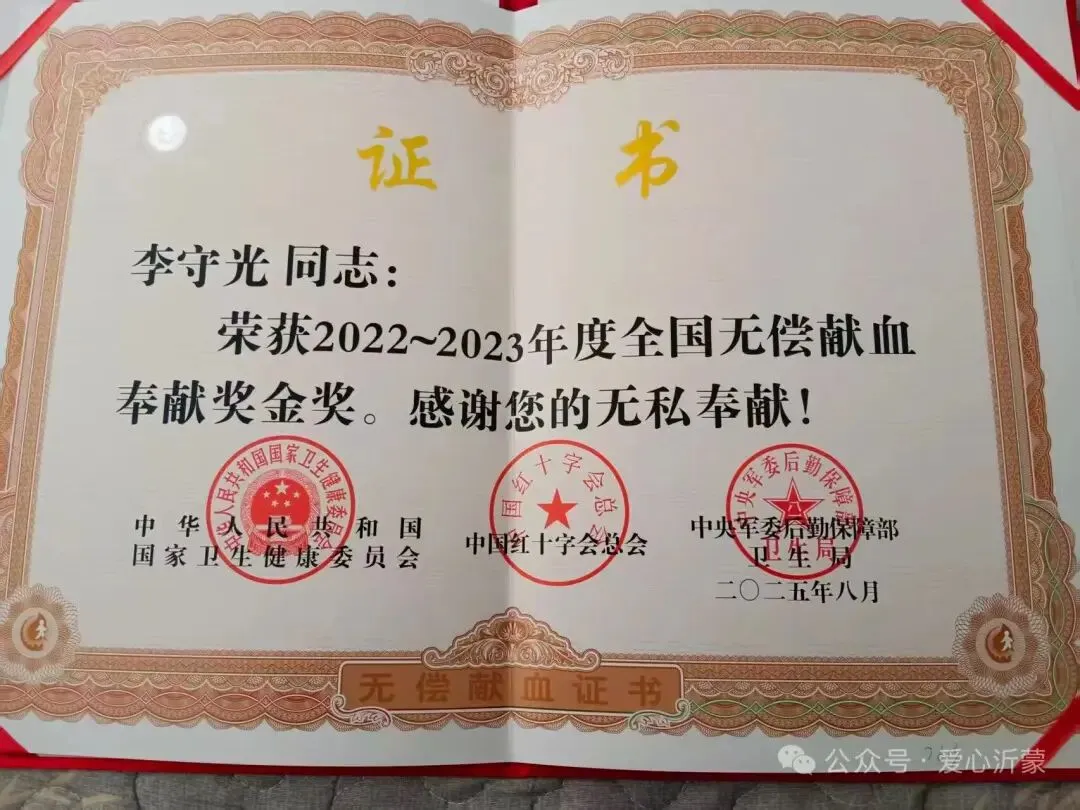 2、1月16日上午,协会党支部书记李守光在临沂市政府参加无偿献血表彰大会,协会党支部书记李守光同志荣获2022~2023年度全国无偿献血奉献奖金奖。