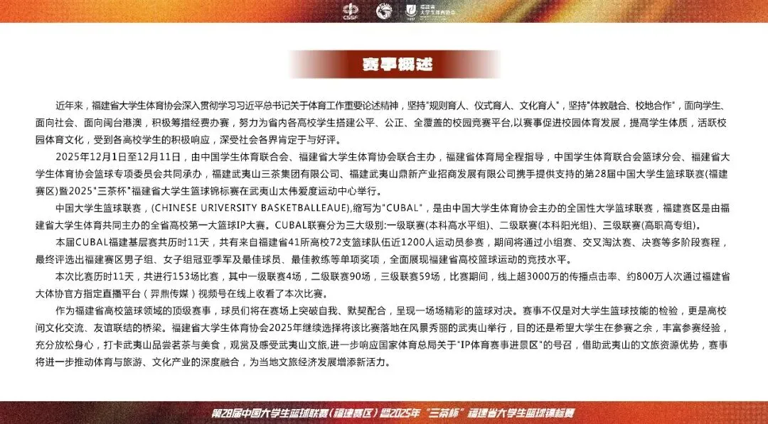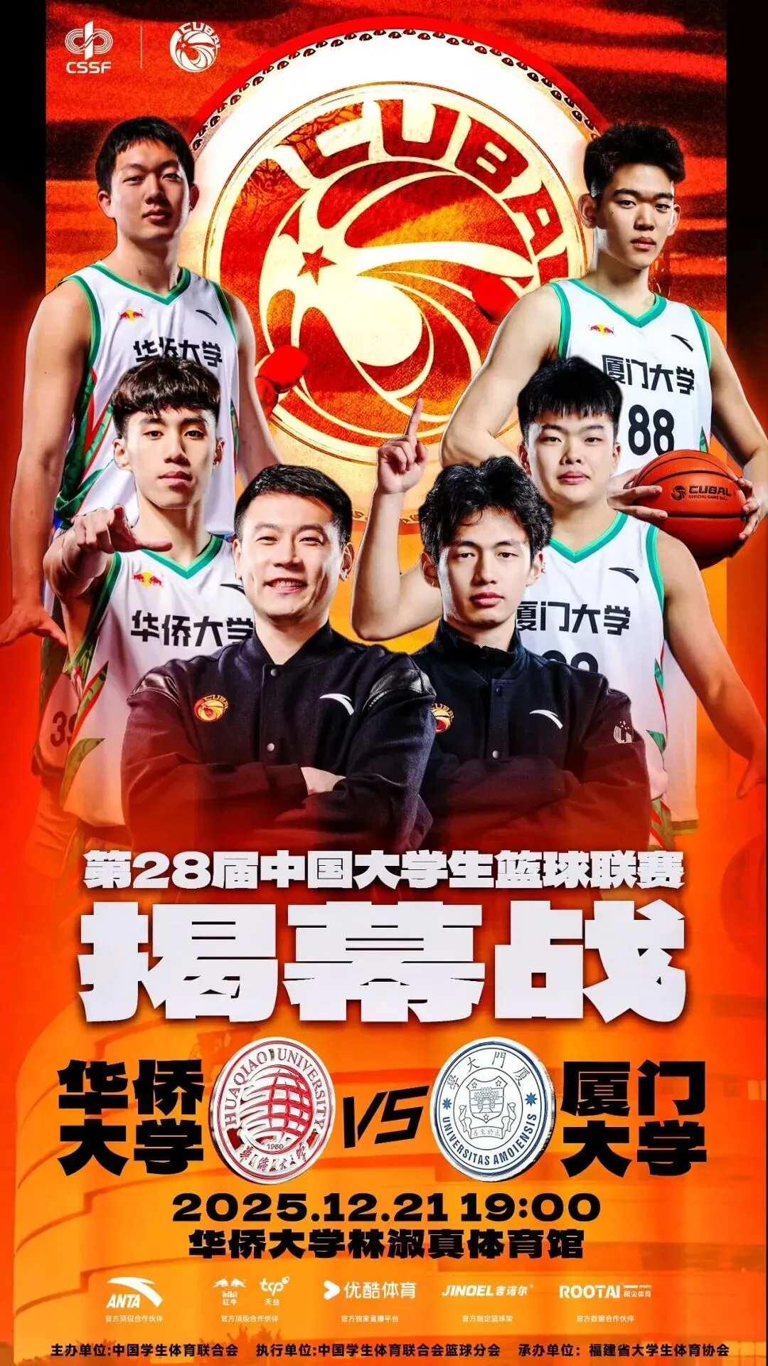 第 28 届中国大学生篮球联赛(CUBAL)揭幕战2025年12月21日晚在福建泉州华侨大学林淑真体育馆燃情打响。