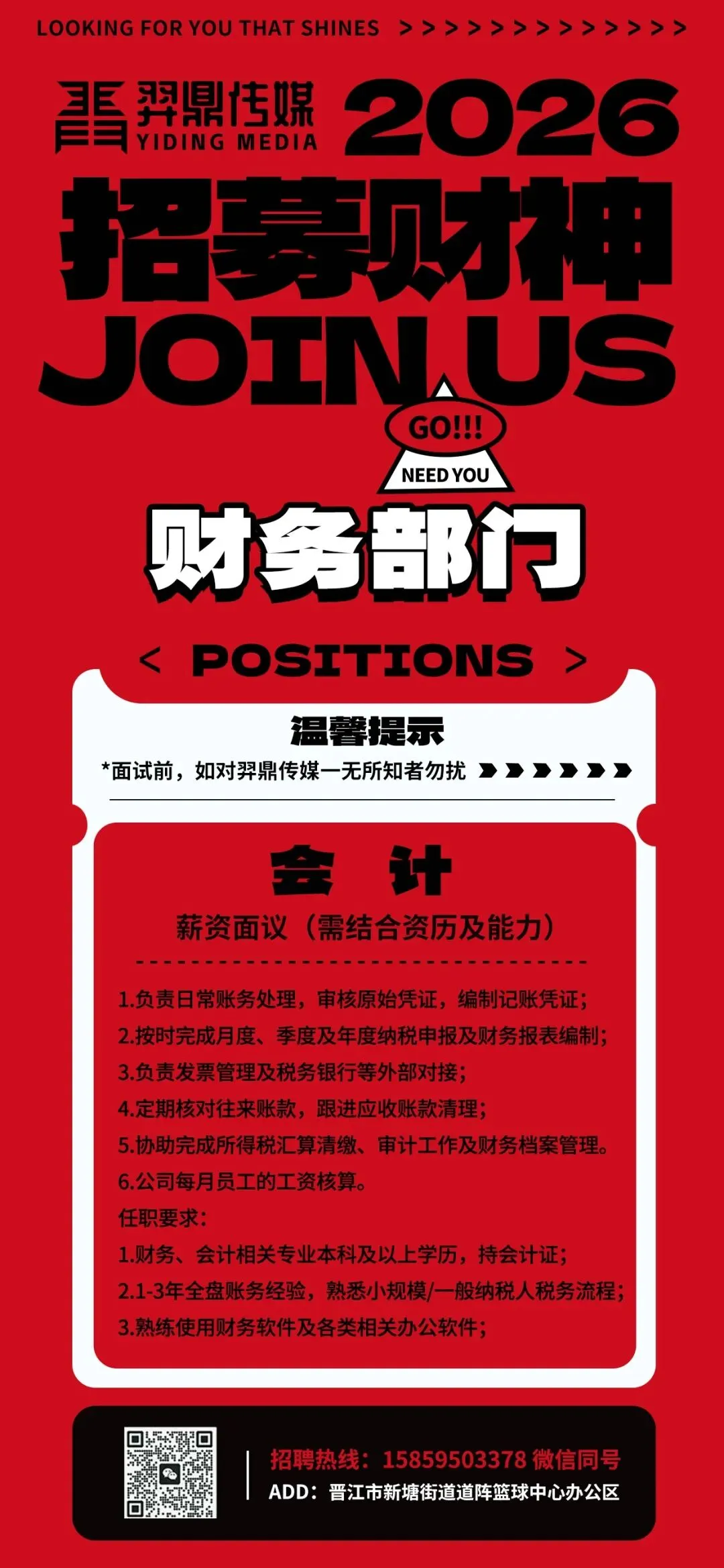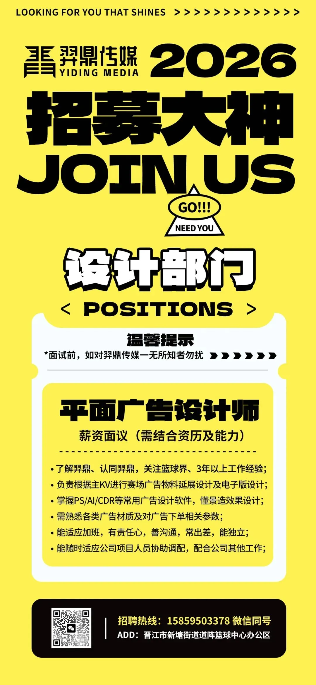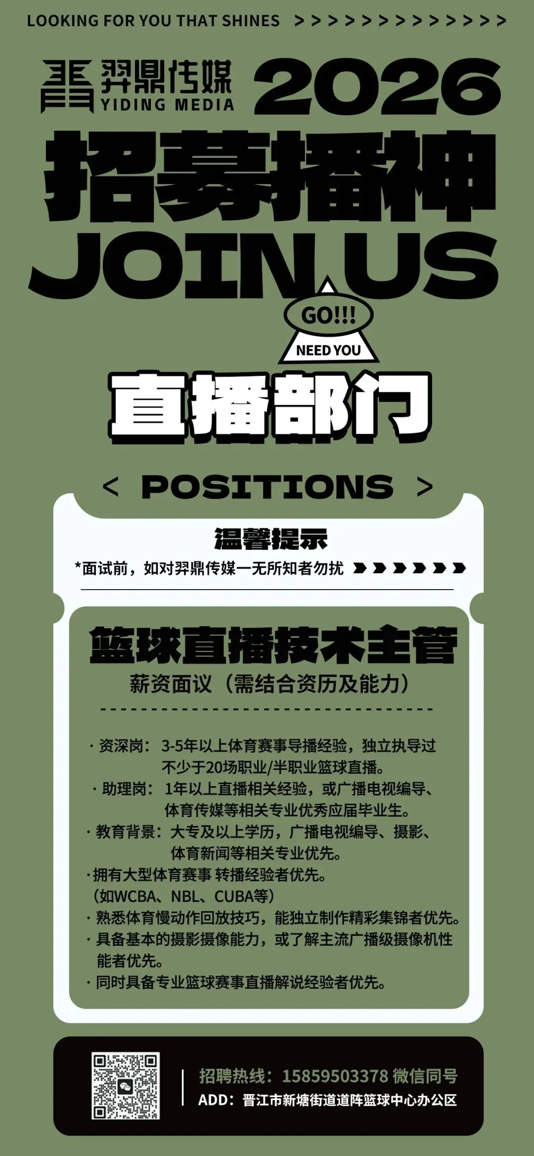 当您能耐心看完并了解完以上关于羿鼎传媒的2026工作总结内容,相必您对我们团队已经有了一定的了解,下面紧急插播一条羿鼎传媒2026年春节招募人才的信息,麻烦时常密切关注篮球圈的大家转发给您觉得适合的亲友,鼓励他(她)加入我们,感谢推荐。