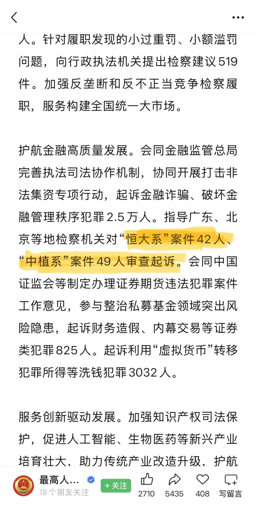 2025年最高人民检察院工作报告中指出:护航金融高质量发展。会同金融监管总局完善执法司法协作机制,协同开展打击非法集资专项行动,起诉金融诈骗、破坏金融管理秩序犯罪2.5万人。指导广东、北京等地检察机关对“恒大系”案件42人、“中植系”案件49人审查起诉。会同中国证监会等制定办理证券期货违法犯罪案件工作意见,参与整治私募基金领域突出风险隐患,起诉财务造假、内幕交易等证券类犯罪825人。起诉利用“虚拟货币”转移犯罪所得等洗钱犯罪3032人。