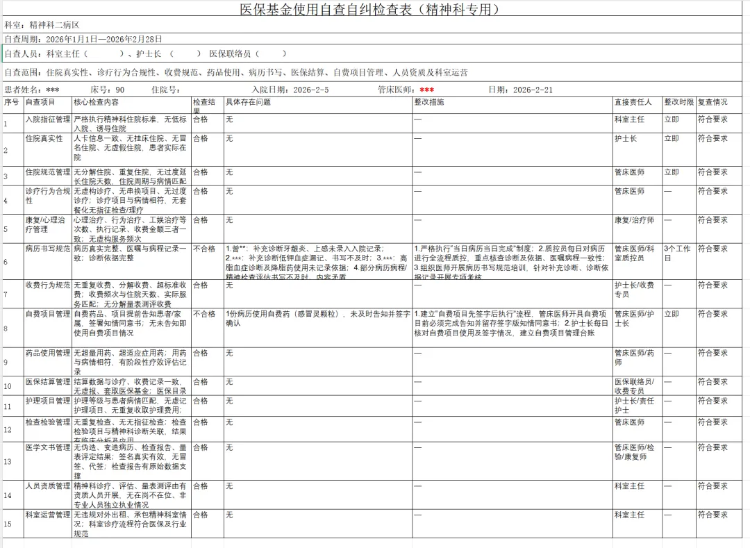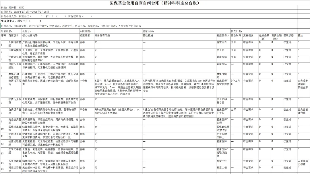 以单人单页的数据自查表为基础,由医保联络员统一整理,填写《医保基金使用自查自纠台账(精神科科室总台账)》,实现自查问题的集中登记、分类管理、整改进度跟踪**,核心内容包括: