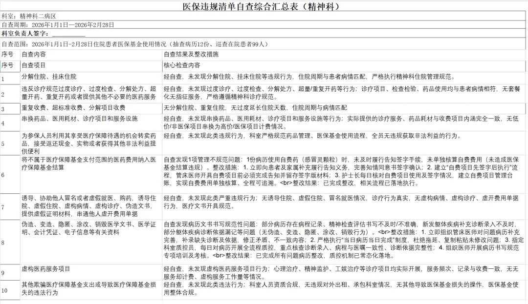 在自查台账基础上,提炼核心数据编制《医保违规清单自查综合汇总表(精神科)》,对照国家医保局明确的十大类医保违规行为(分解住院、过度诊疗、违规收费、串换项目等),整体汇总科室自查结果: