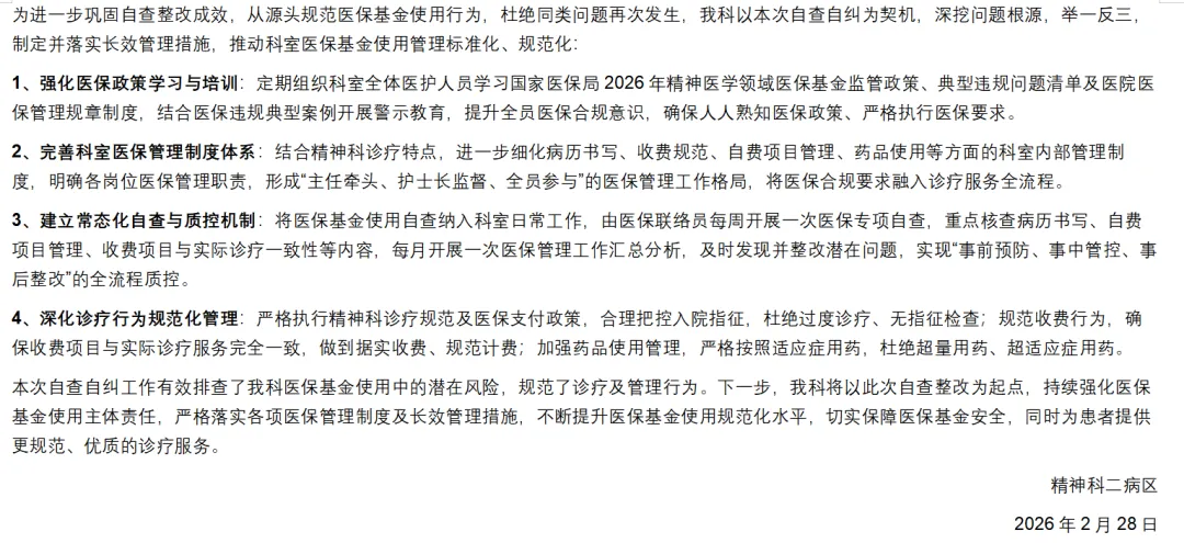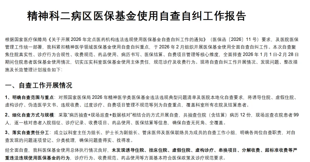 精神科医保自查自纠工作严格依据国家医保局《关于开展2026年定点医药机构违法违规使用医保基金自查自纠工作的通知》要求开展,以压实主体责任、规范基金使用、排查违规风险为核心,形成“组建小组→专项自查→台账登记→汇总分析→报告形成”的标准化工作流程,同时配套建立自查台账、汇总表与文字报告的全流程资料体系,具体内容如下: