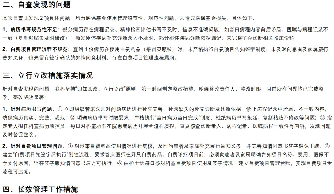 3、长效落地:以自查自纠为契机,将医保合规要求融入科室日常诊疗管理,建立常态化自查、日常质控、定期培训的长效机制,杜绝同类问题重复发生;