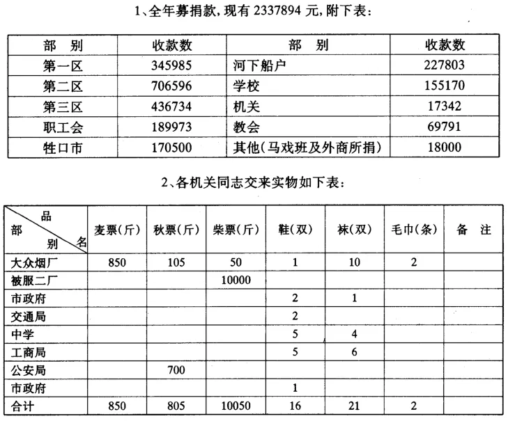 (四)、一次搞成,切记再募二回。第一次搞不好,虽再行勉强捐募,也很难获得良好的影响与完成任务。如工会在市救总会布置以前即行自由捐募,待规定其任务后进行了摊派,也还未能十足地完成任务,群众纷纷叫苦,干部反认为领导上任务分配不当。