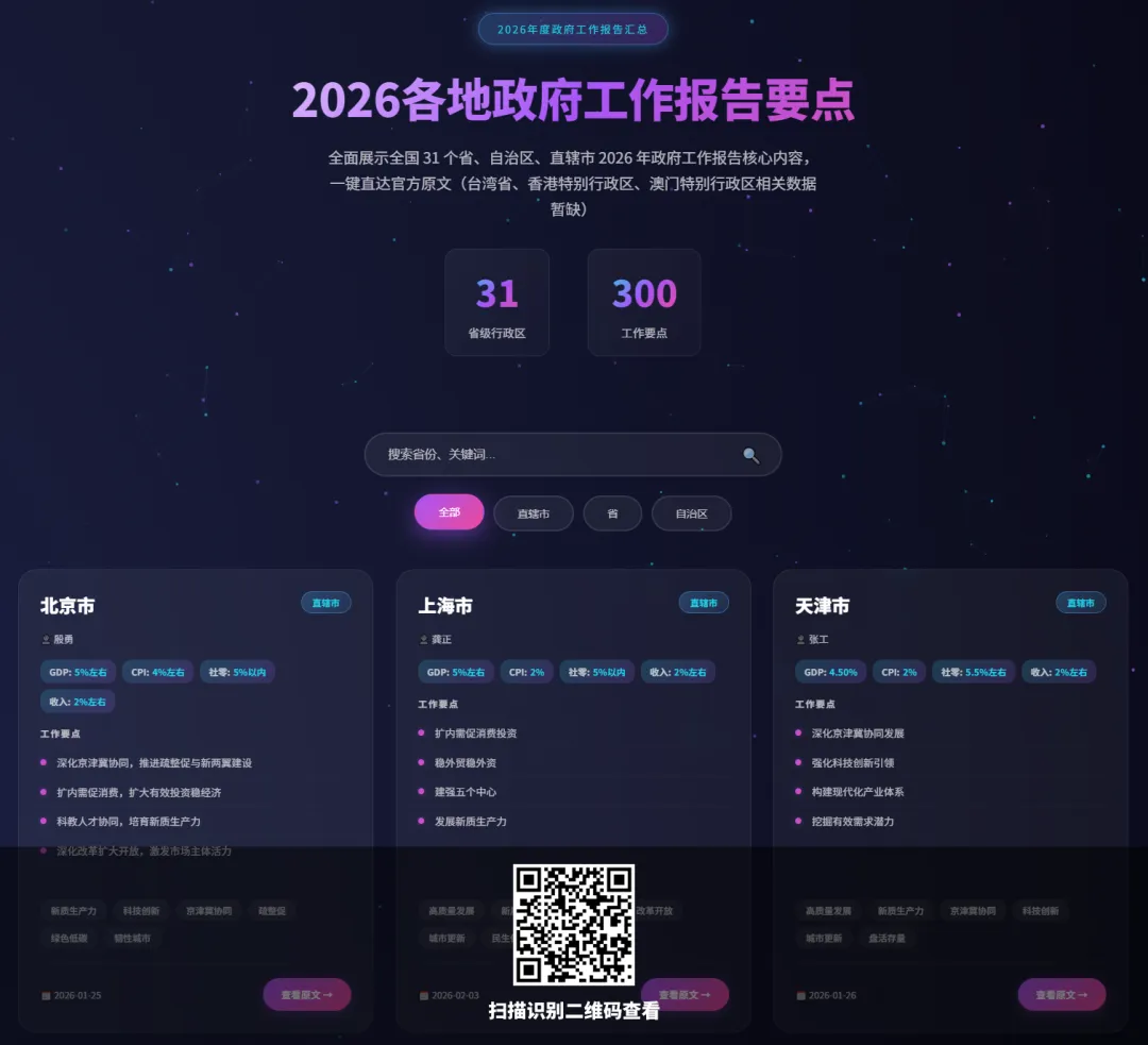 2026 年,全国各省、自治区、直辖市的政府工作报告均明确聚焦 “十五五” 开局的核心任务,所有量化指标、重点举措均指向 2026 年具体实施内容,既体现了全国发展的共性要求,又彰显了地方特色。各地以新质生产力培育为核心动力,以扩大内需为战略基点,以民生改善为根本目的,以绿色转型为必由之路,勾勒出清晰的 2026 年高质量发展蓝图。在实干笃行中,各地将持续破解发展难题、激发发展活力,为全面推进中国式现代化注入强劲地方动能。