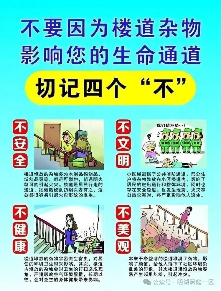 (四)请业主自行对房屋外、走廊、消防通道等公共区域进行检查,及时清理杂物、垃圾等个人物品,确保楼内消防安全。消防安全大于天,请各居民相互告知,做好安全防范工作,不要将楼道变成“杂物间”。以免因一时方便造成不可挽回的后果。工作人员对楼道杂物进行清理时,望理解和配合! 感谢您对我们工作的理解与支持,如您有任何疑问请至物业服务中心咨询。