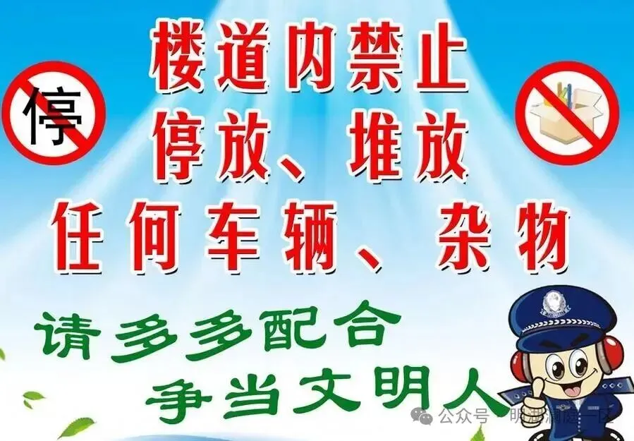 您好!为了给业主创造整洁、温馨、安全的居住环境,维护公共区域环境卫生,请不要将鞋架、纸箱、垃圾、花盆、泡沫箱、自行车、玩具车等杂物存放在电梯前室、楼梯间或水电井等公共区域。