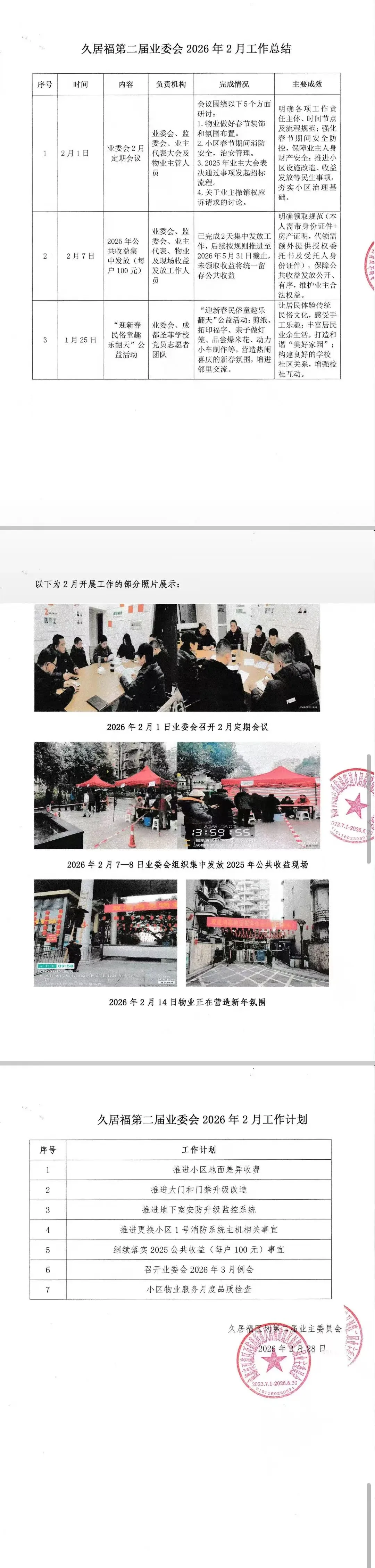 为了让大家更好地了解业委会每月开展的工作情况,共同参与小区治理,协力创建更美丽的幸福家园。业委会将2026年2月的工作总结以及2026年3月计划开展的重要工作内容进行公示,供大家知晓。