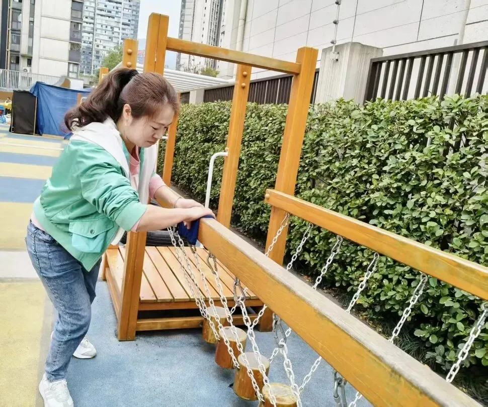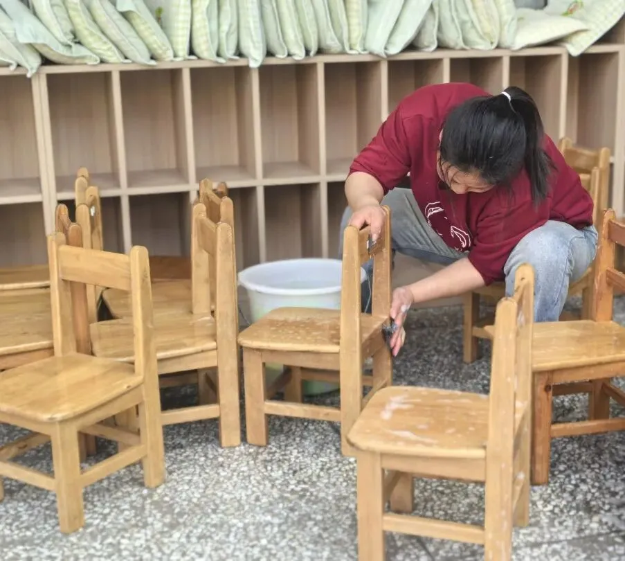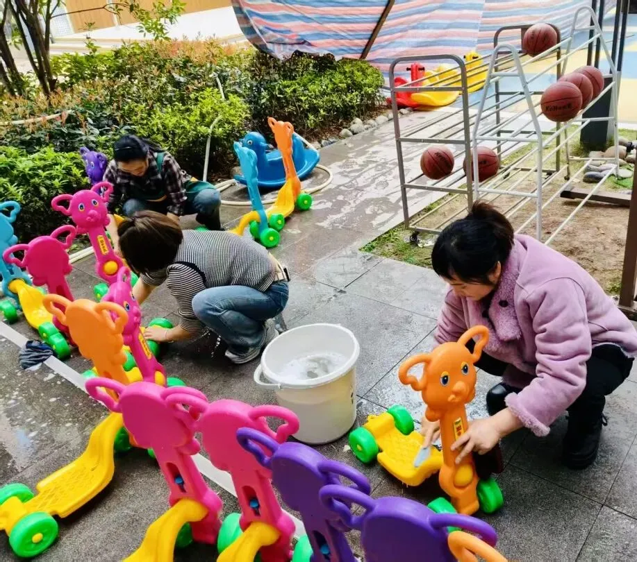 后勤团队对校园环境进行了全面的卫生大扫除,并对校园环境和物品材料、设备设施、玩具等进行了消毒消杀,幼儿活动室、午睡室进行了开窗通风。经过后勤人员的努力工作,校园以美丽、整洁的风貌迎接孩子们的到来。