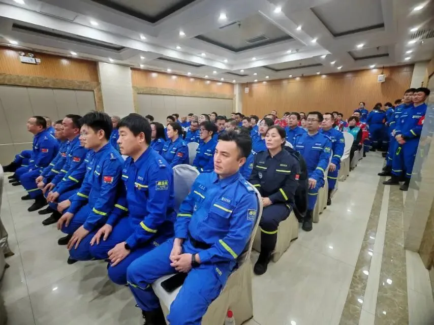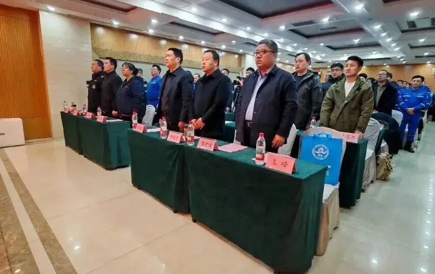 会议在庄严的国歌声中正式拉开帷幕,全体人员肃立注目,歌声铿锵有力,彰显着蓝天人对党和人民的忠诚,以及对公益救援事业的坚定信念。