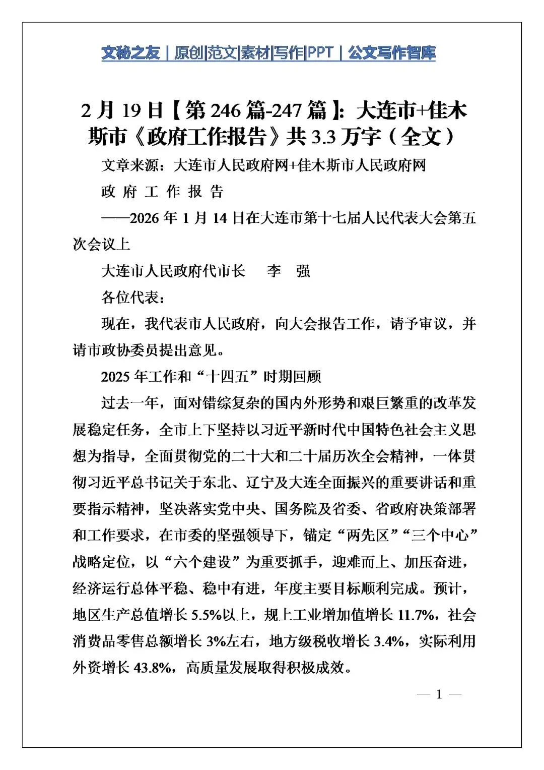 亲爱的文友,我今天推荐的文章是《大连市、佳木斯市政府工作报告全文(3.3万字)》