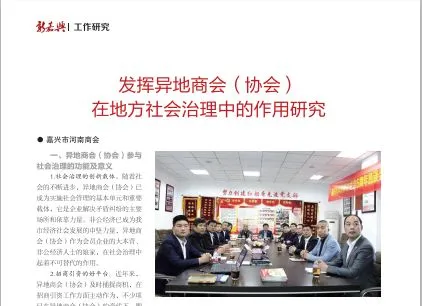 5月份,《“三治”背景下异地商会(协会)在地方社会治理中的作用研究》内容在嘉兴党刊《新嘉兴》中刊发,据了解,这也是商(协)会首次在《新嘉兴》上刊发文章