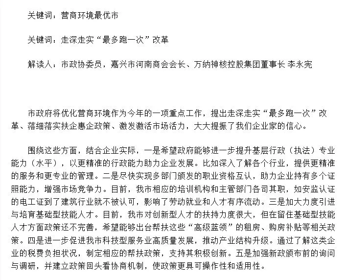 1月16日,嘉兴日报两会专刊,李永宪会长就最多跑一次“内容接受采访