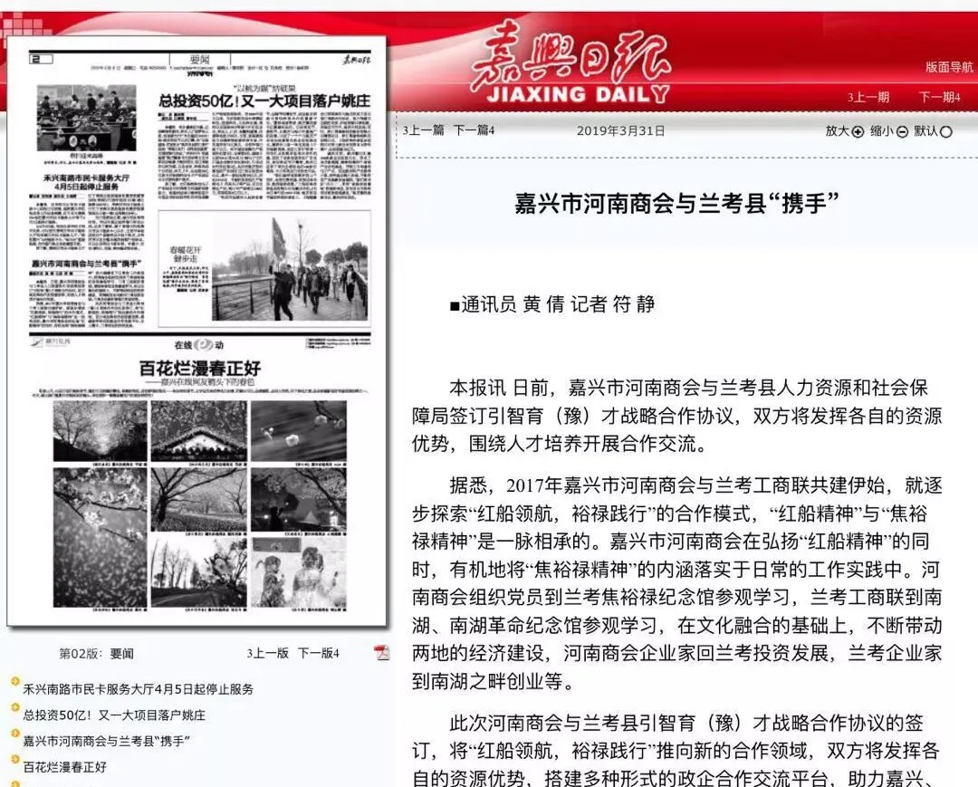3月31日,嘉兴日报报道河南商会与兰考签订“引智育(豫)才”协议内容