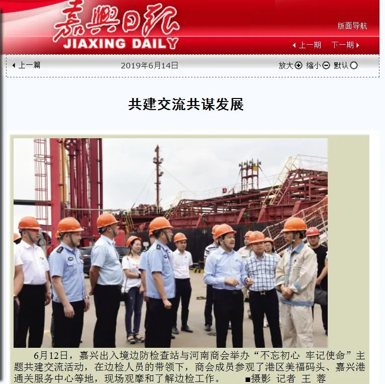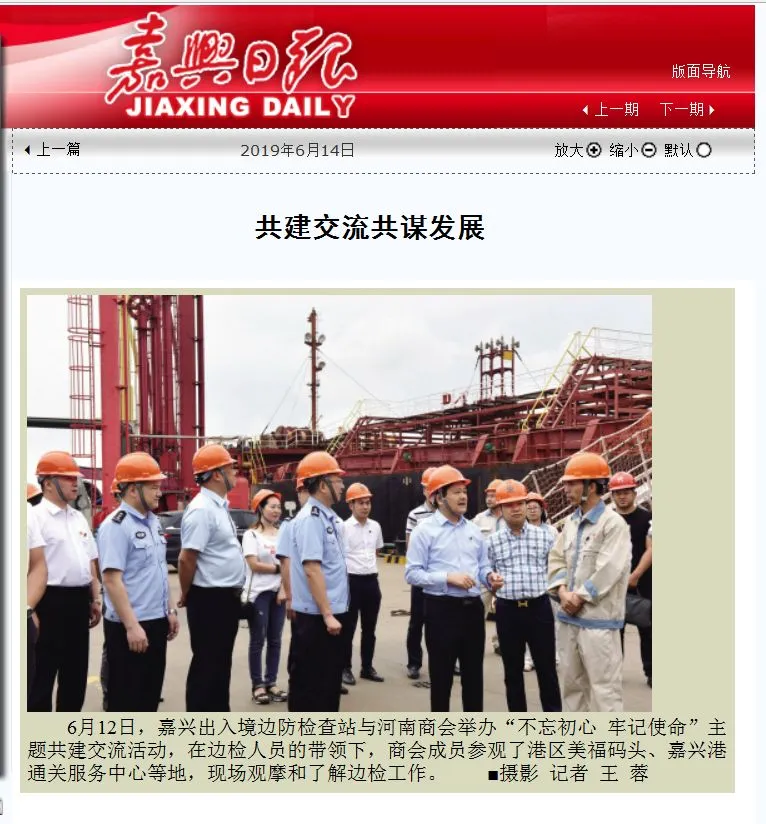 6月14日,嘉兴日报对河南商会与嘉兴出入境边防检查站开展的“不忘初心、牢记使命”主题教育进行报道