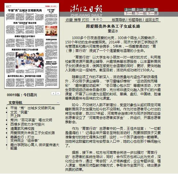 5月7日,浙江日报报道河南商会与同济大学浙江学院开展的育苗行动