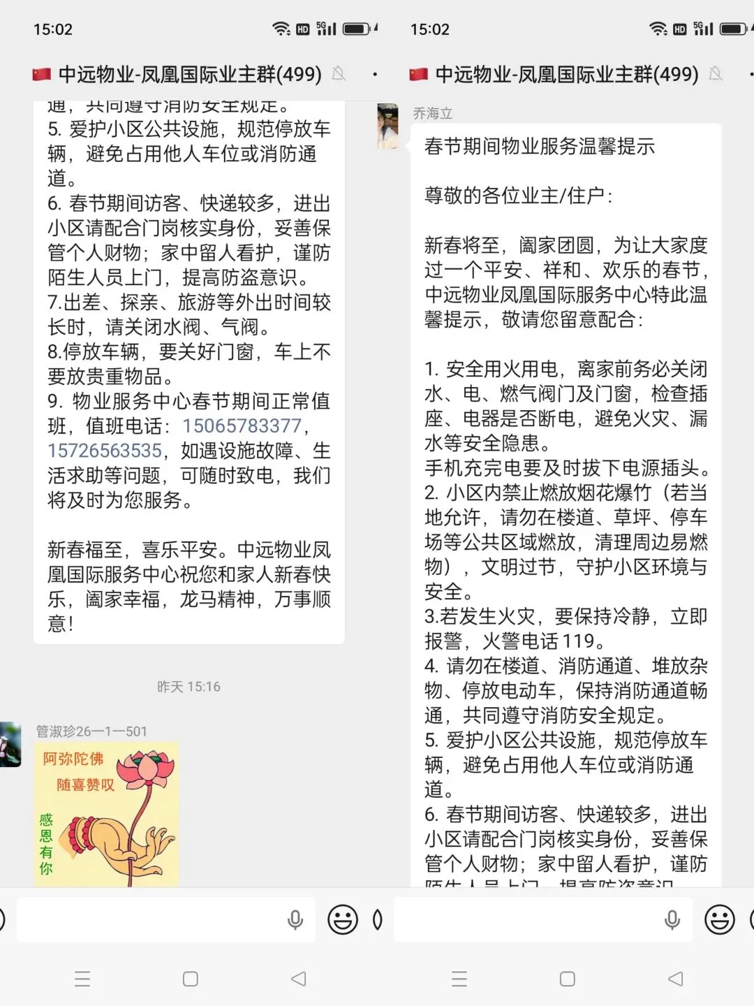 业主群里发温馨提示,提醒业主节日期间注意安全,并告知业主春节期间,物业正常值班,有事都可以找物业,我们24小时有值班电话。