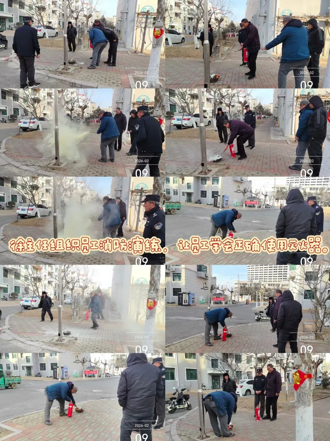 年前,徐主任组织员工进行一次消防演练,教给员工正确使用灭火器,尤其是保安,春节期间一定要多巡逻,春节期间放烟花爆竹一定不能引起火灾!
