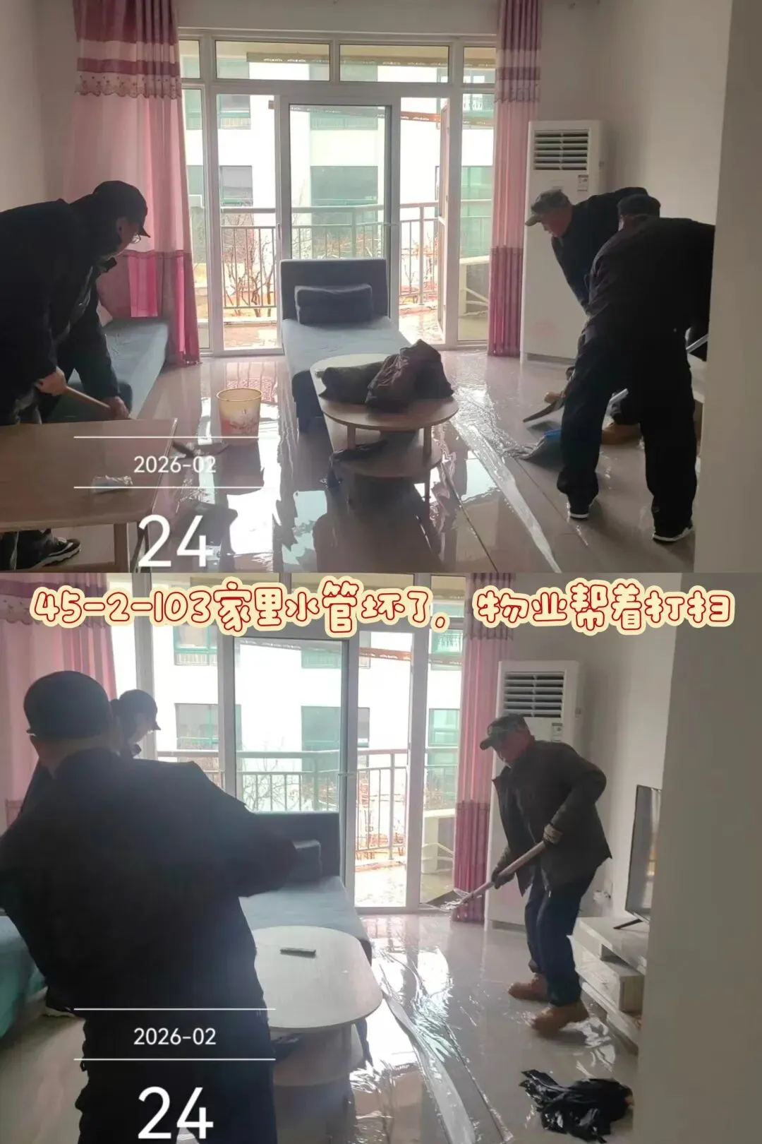 45号楼业主家里跑水,徐主任安排物业工作人员帮业主打扫,业主表示非常感谢!