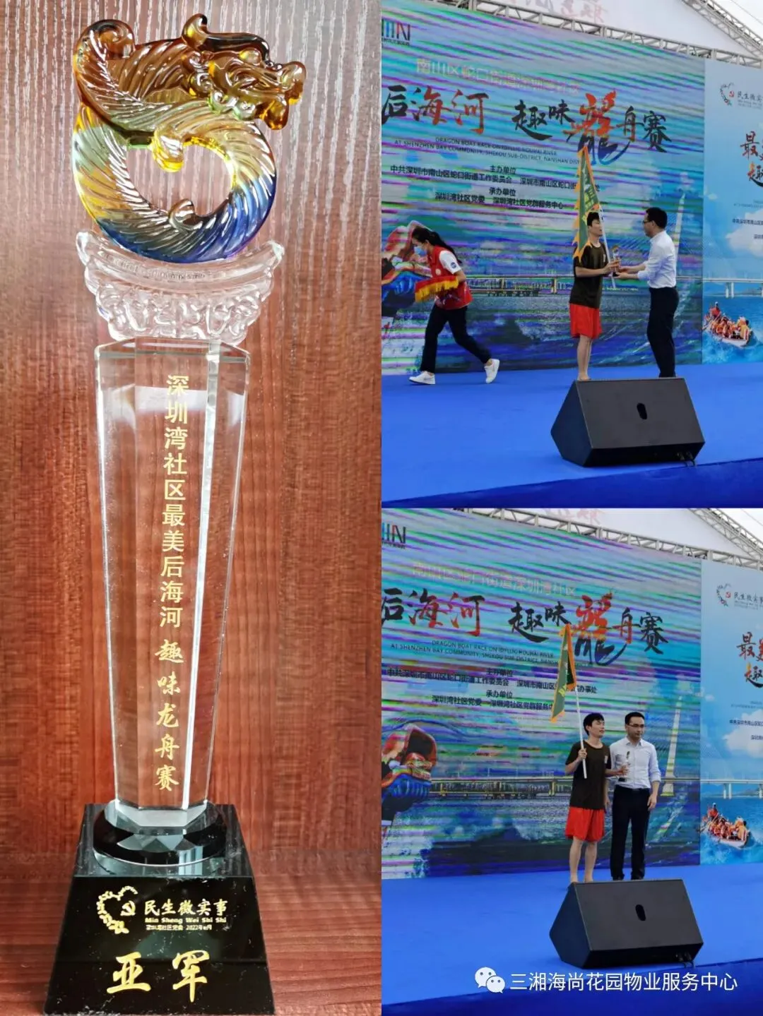 端午节,赛龙舟。赛龙舟是端午节的传统习俗之一,三湘海尚队参加了深圳湾社区组织的龙舟比赛,经过大家齐心协力的努力,获得比赛第二名。