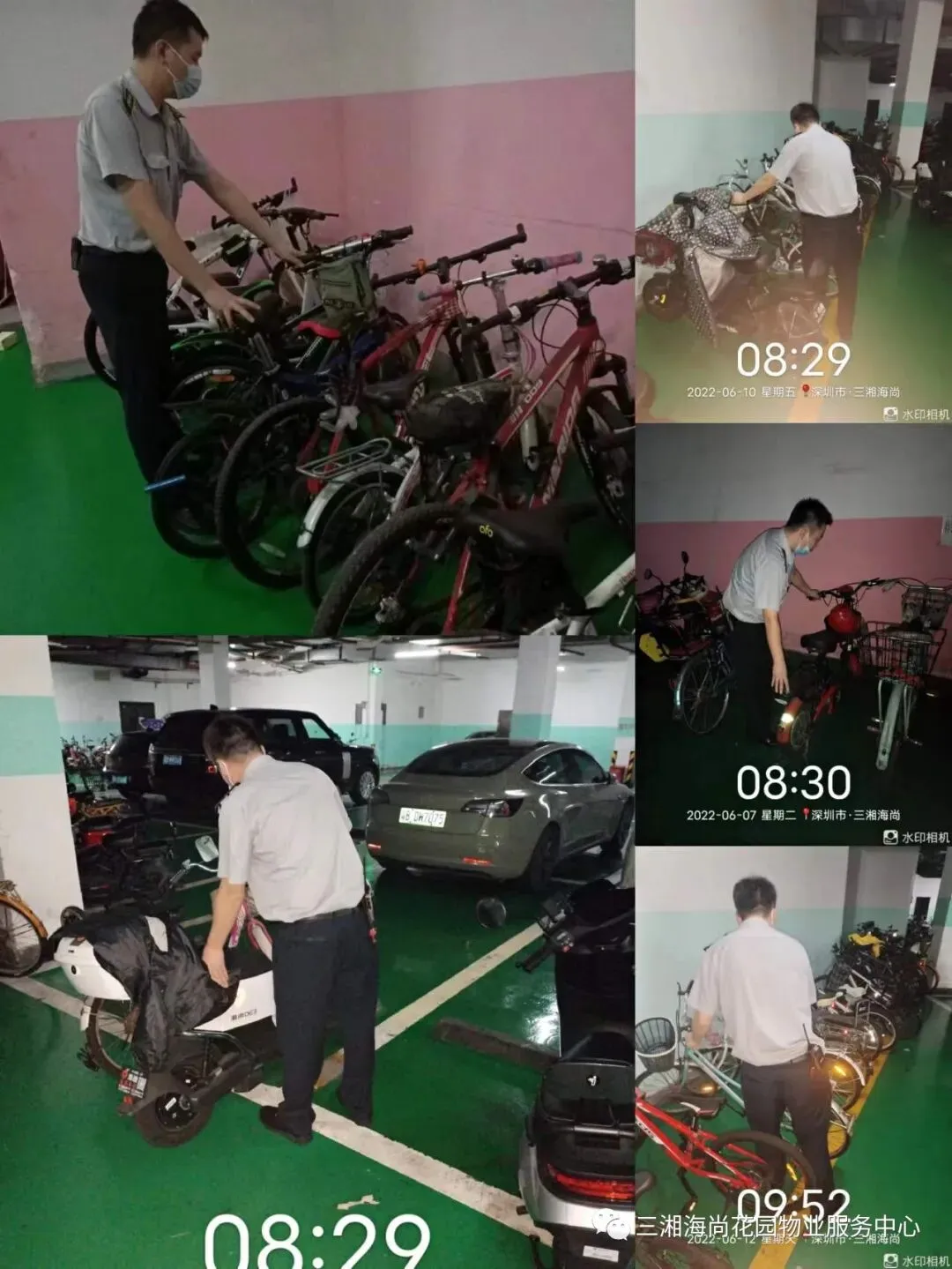 5、停车场电动车、自行车整理,摆放整齐,方便他人停放,方便他人行走。