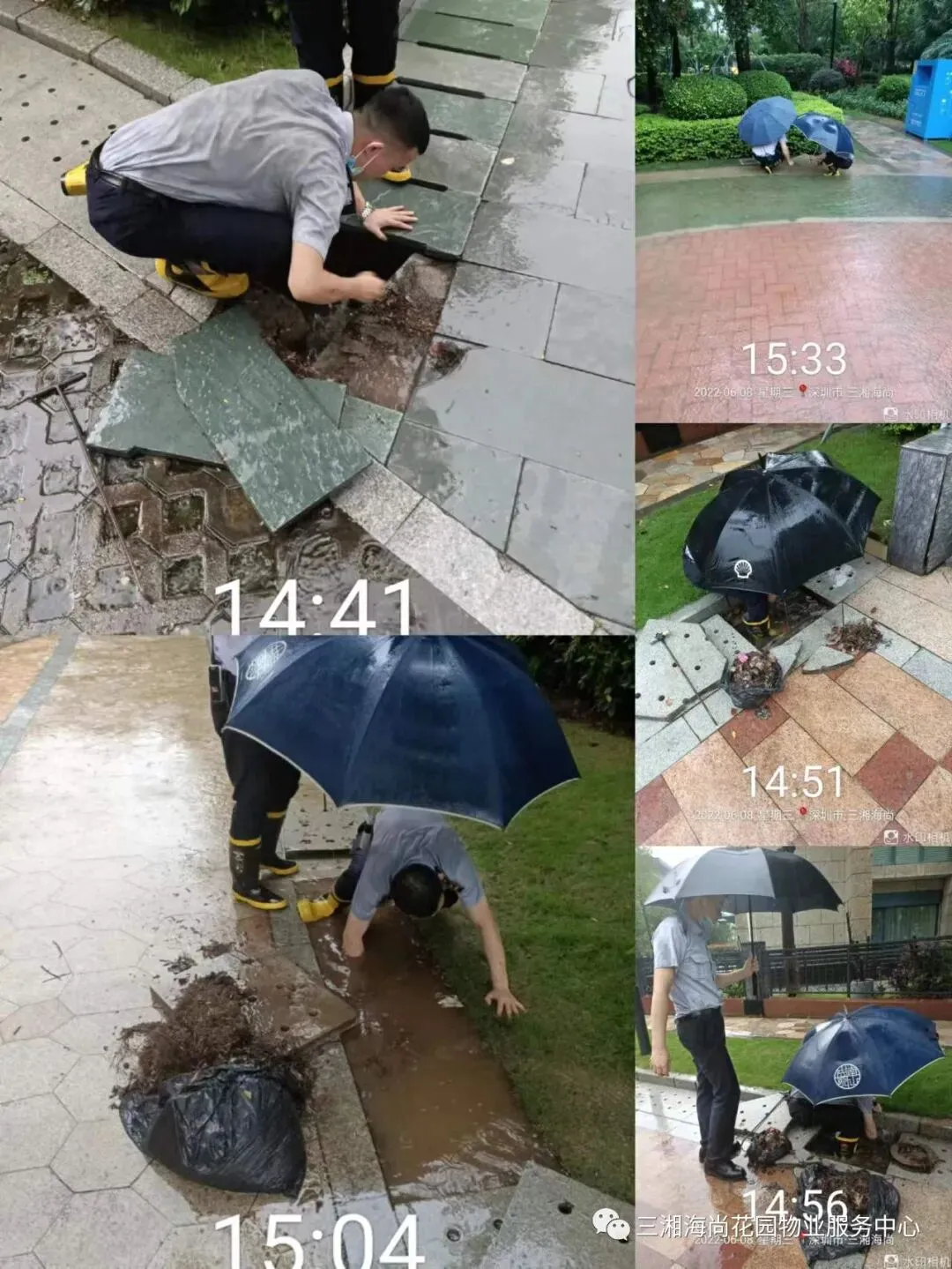 台风暴雨天气,排查每个排水口,保证流水畅通,防止堵塞积水。