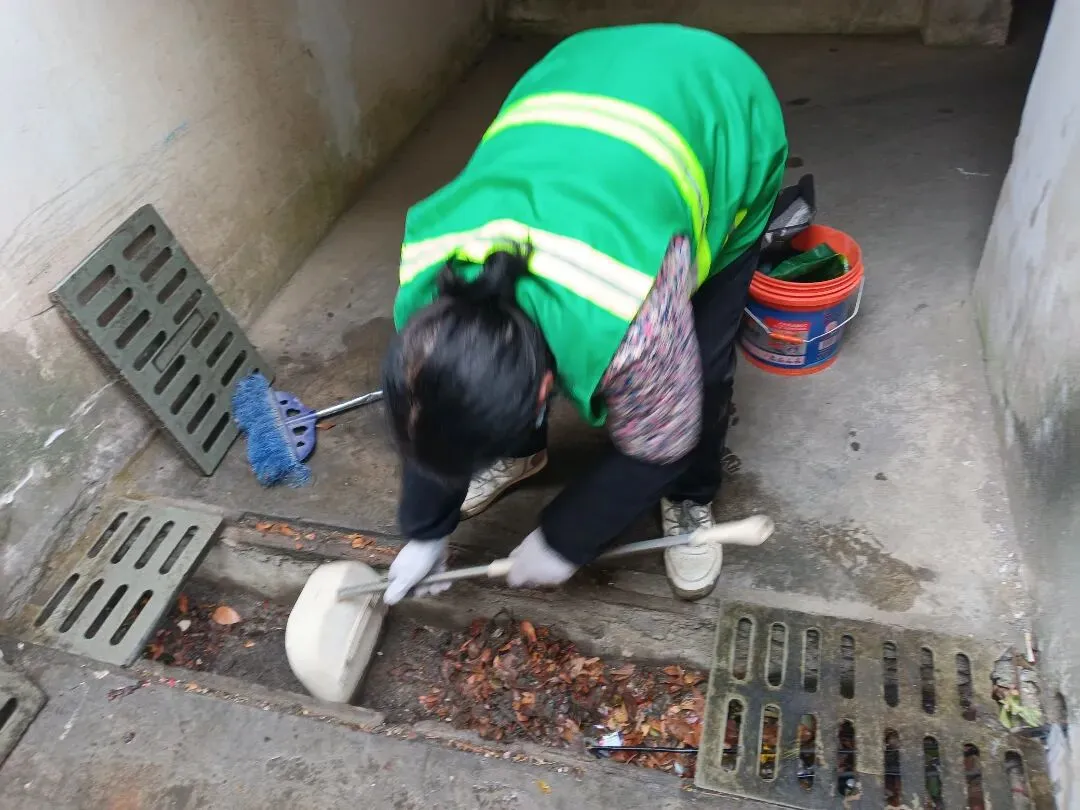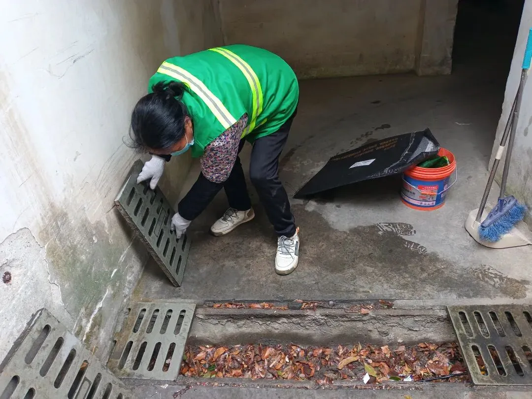▲清理储藏室排水沟落叶