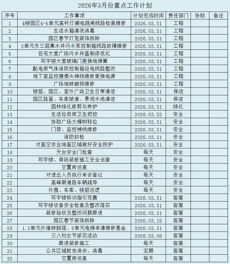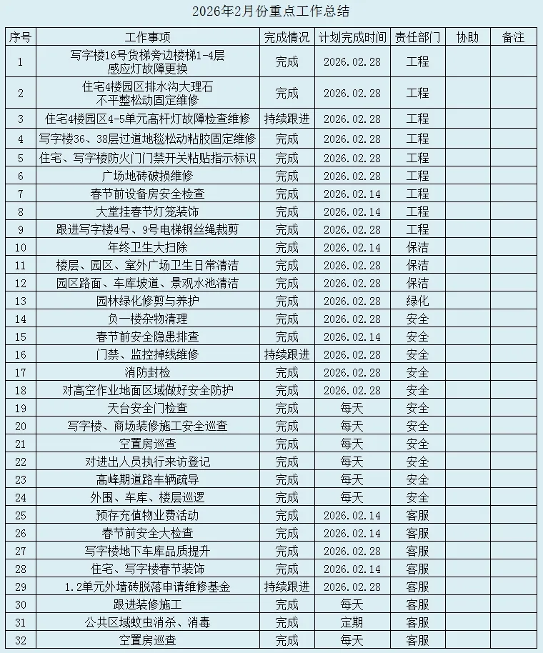 二月的寒意渐退,三月的暖风轻拂。为了更好地提升物业服务品质,让您更加及时地了解我们的工作,在此,荣灿物业服务中心为您献上二月份的工作报告。三月,我们将继续努力提升服务品质,营造一个优美、舒适、安全、文明的环境。