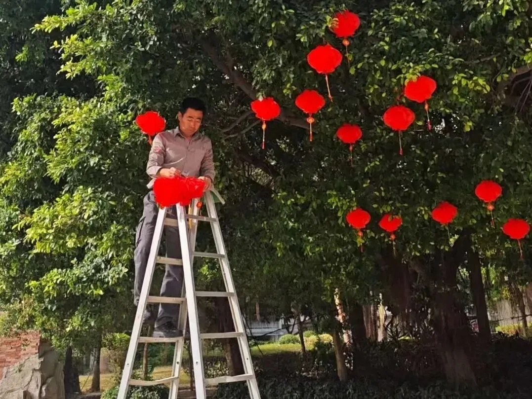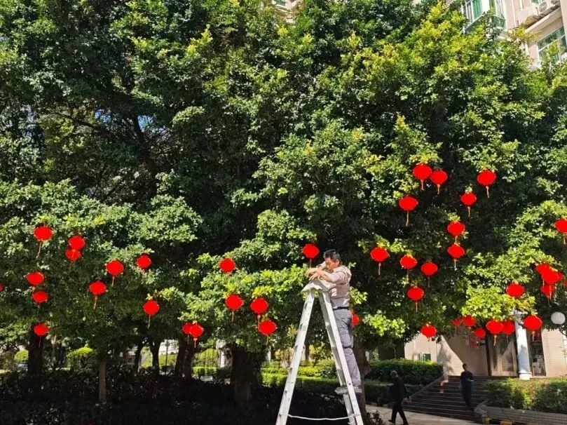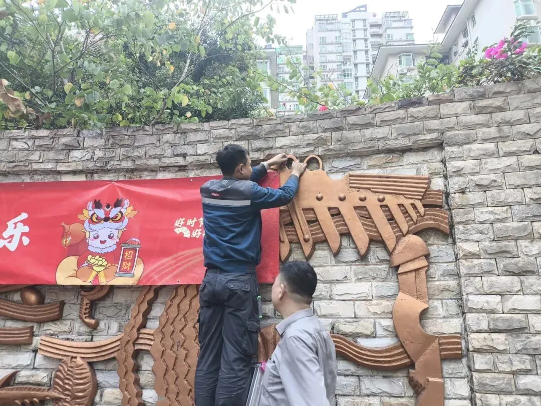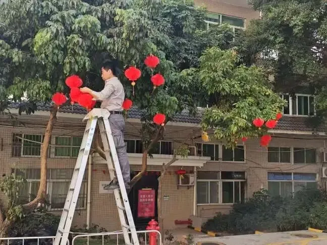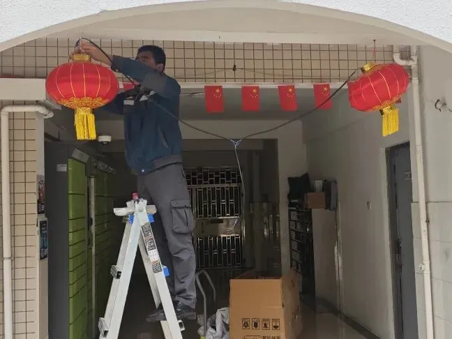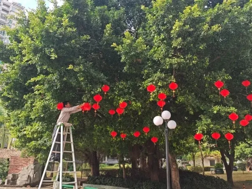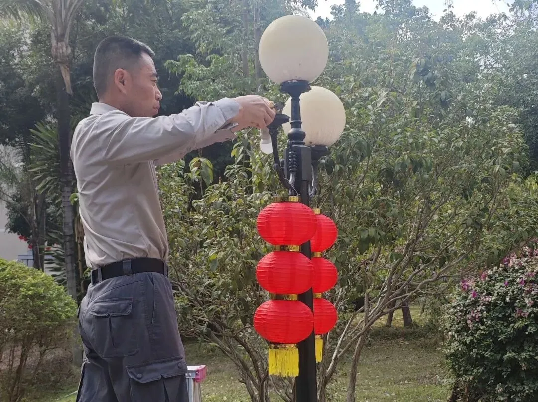 营造喜庆祥和的新春氛围,进行节日彩灯悬挂、线路规划等布置工作。