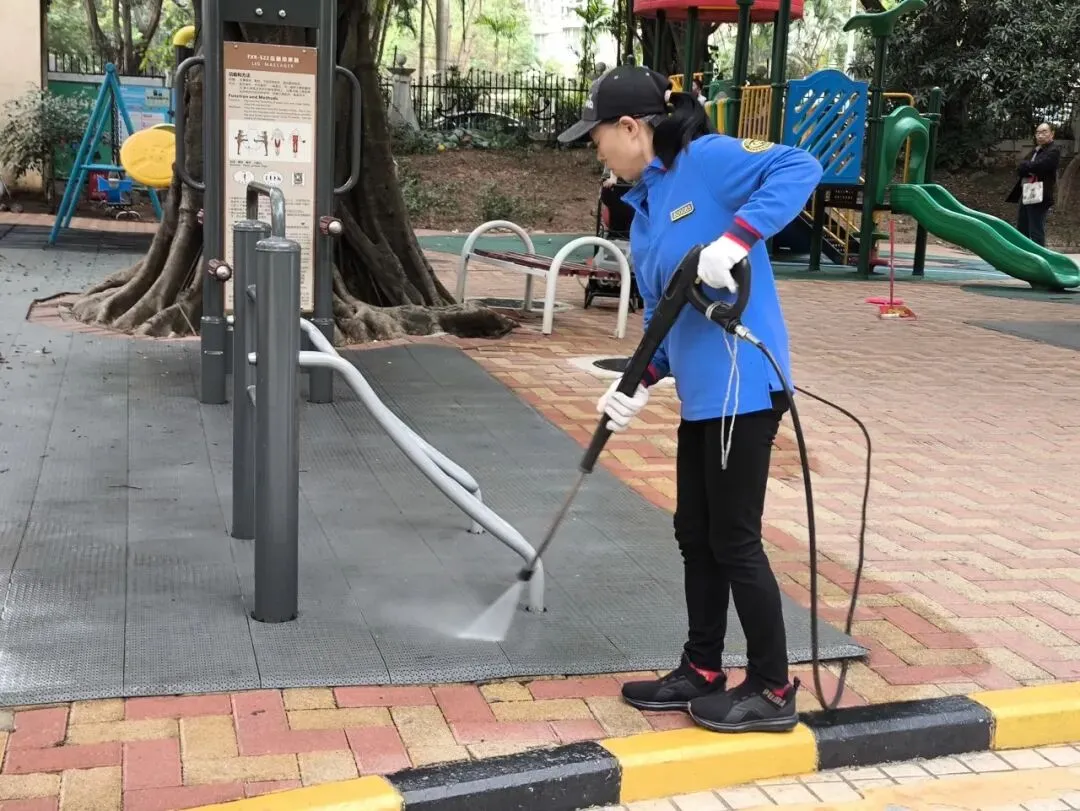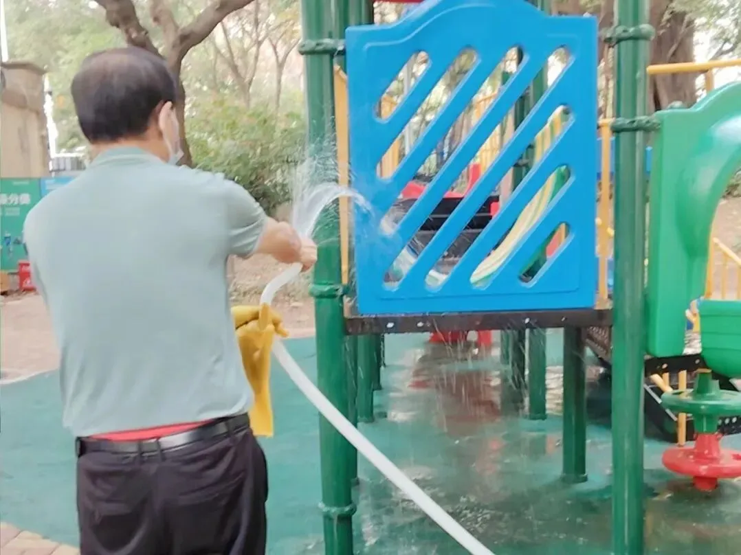 每日对小区楼层、公共区域等进行清洁,擦洗小区桌椅、指示牌、游乐设施等,保持小区干净整洁。