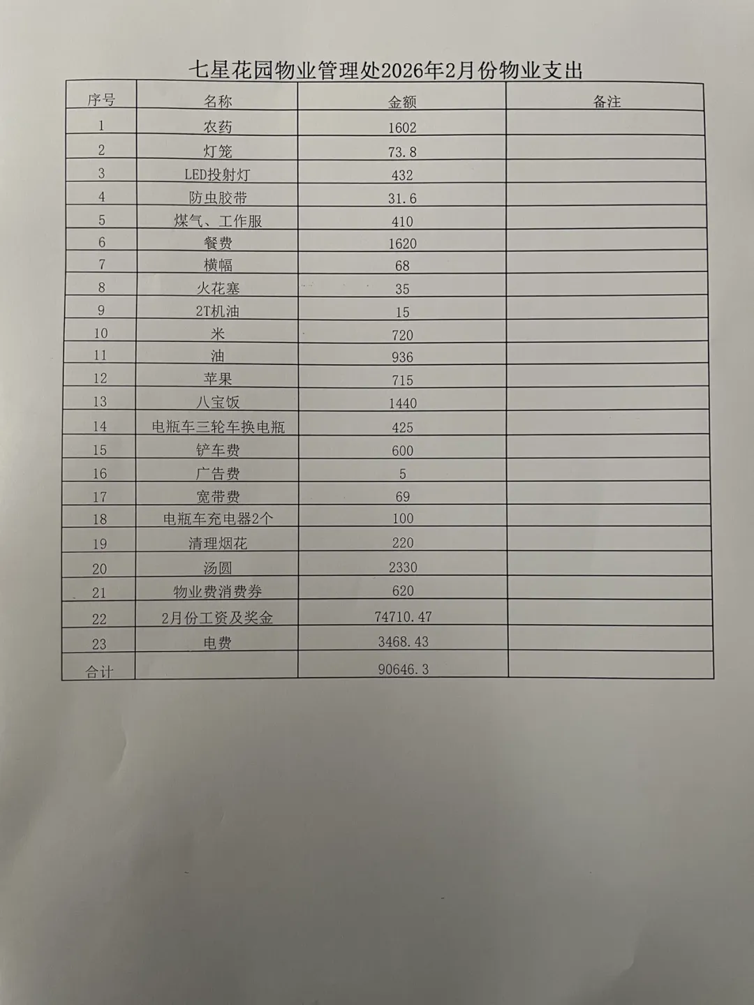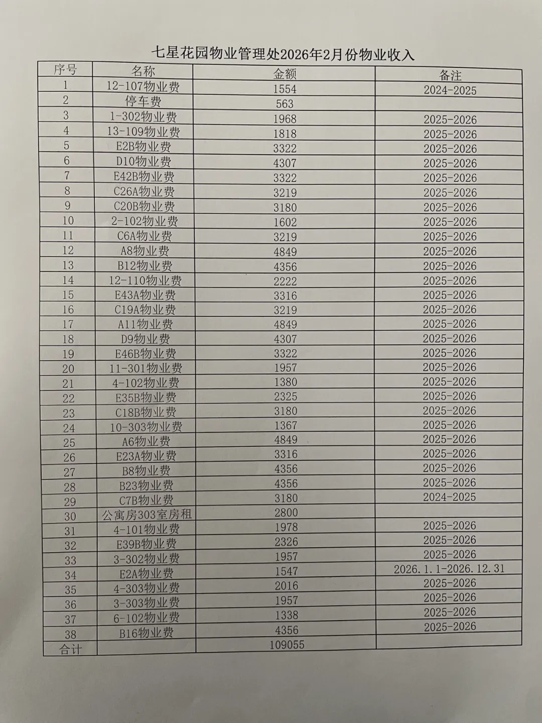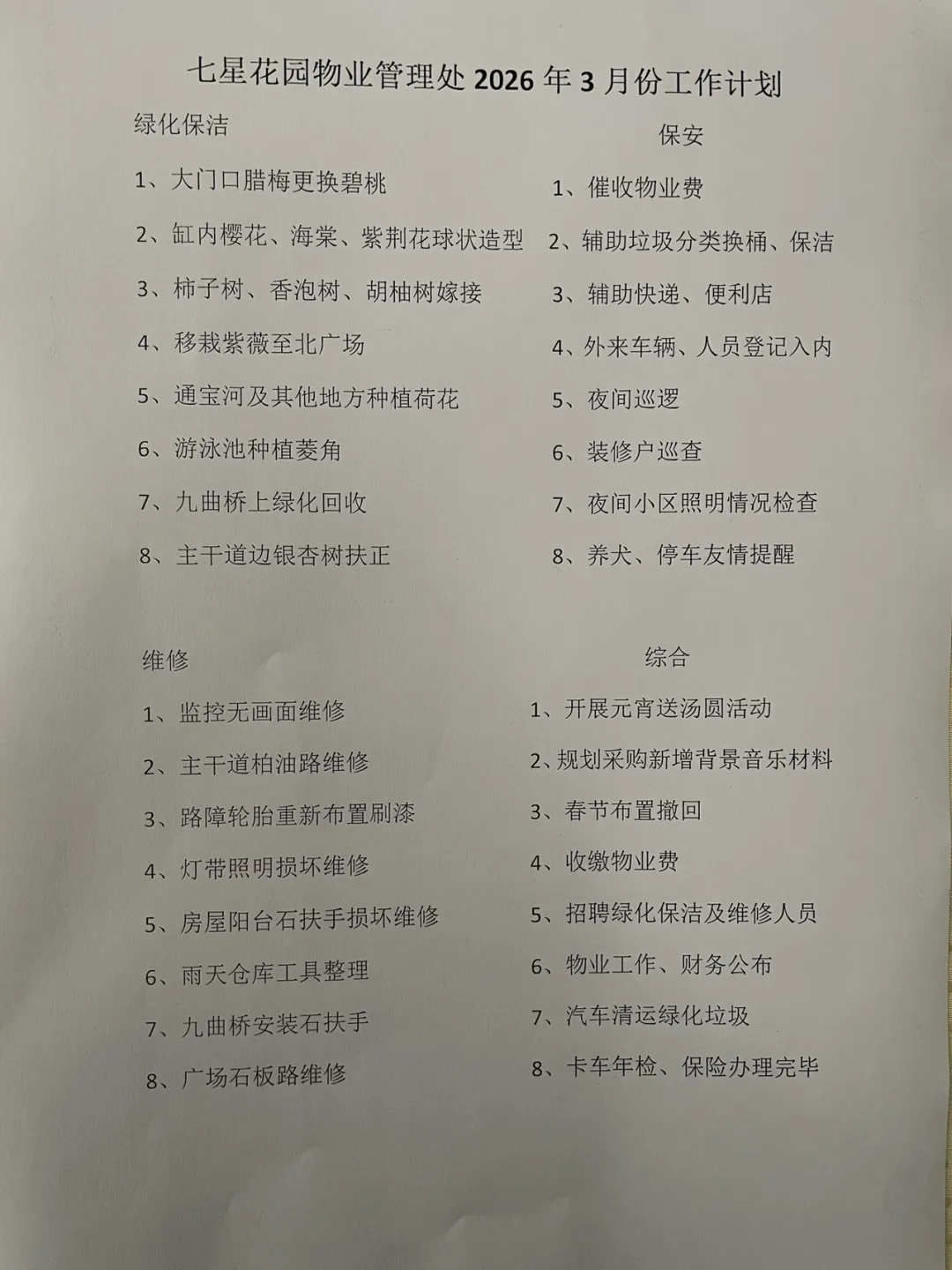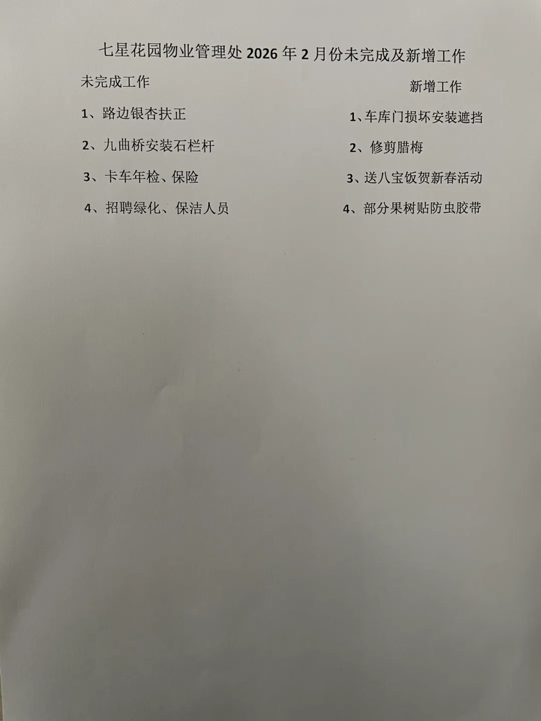 七星花园物业管理处2026年2月份主要开展以下工作:1、棚架紫藤修剪整理;2、清理房屋前后建筑垃圾、绿化垃圾若干;3、九曲桥内侧绿化移除;4、房屋石扶手栏杆损坏维修3户;5、背景音乐修复;6、荷花池水坝填建筑垃圾若干;7、主干道更换损坏投光灯16个,灯带拉直;8、石片道路柏油维修若干;9、清运绿化垃圾5车;10、道闸粘贴马年广告;11、车库门损坏安装遮挡;12、部分腊梅修剪;13、果树粘贴防虫胶带若干;14、开展送八宝饭贺新春活动;15、辅助快递、便利店,辅助垃圾分类房换桶、保洁;16、日常外来人员、车辆管理,夜间保安巡更;17、辅助可回收垃圾收取;18、每月物业工作、财务公布;19、2025-2026物业费收取;20、开年终总结会;21新春喜庆布置;22、清理节中烟花爆竹若干;23、日常各条道路保洁;截至2026年2月28日小区已入住222户,装修14户、出租2户;2025年9月1日至2026年8月31日已缴纳物业费149户,缴纳率48.5%。