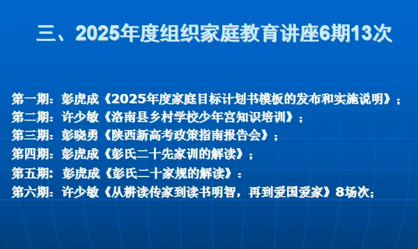 十九、2025年12月1日~12月12日,我组织专家委员会主席许少敏老师先后受邀前往景村镇中心小学、城关镇八里小学、洛南县第六幼儿园开展了为期十天的家庭教育讲座。