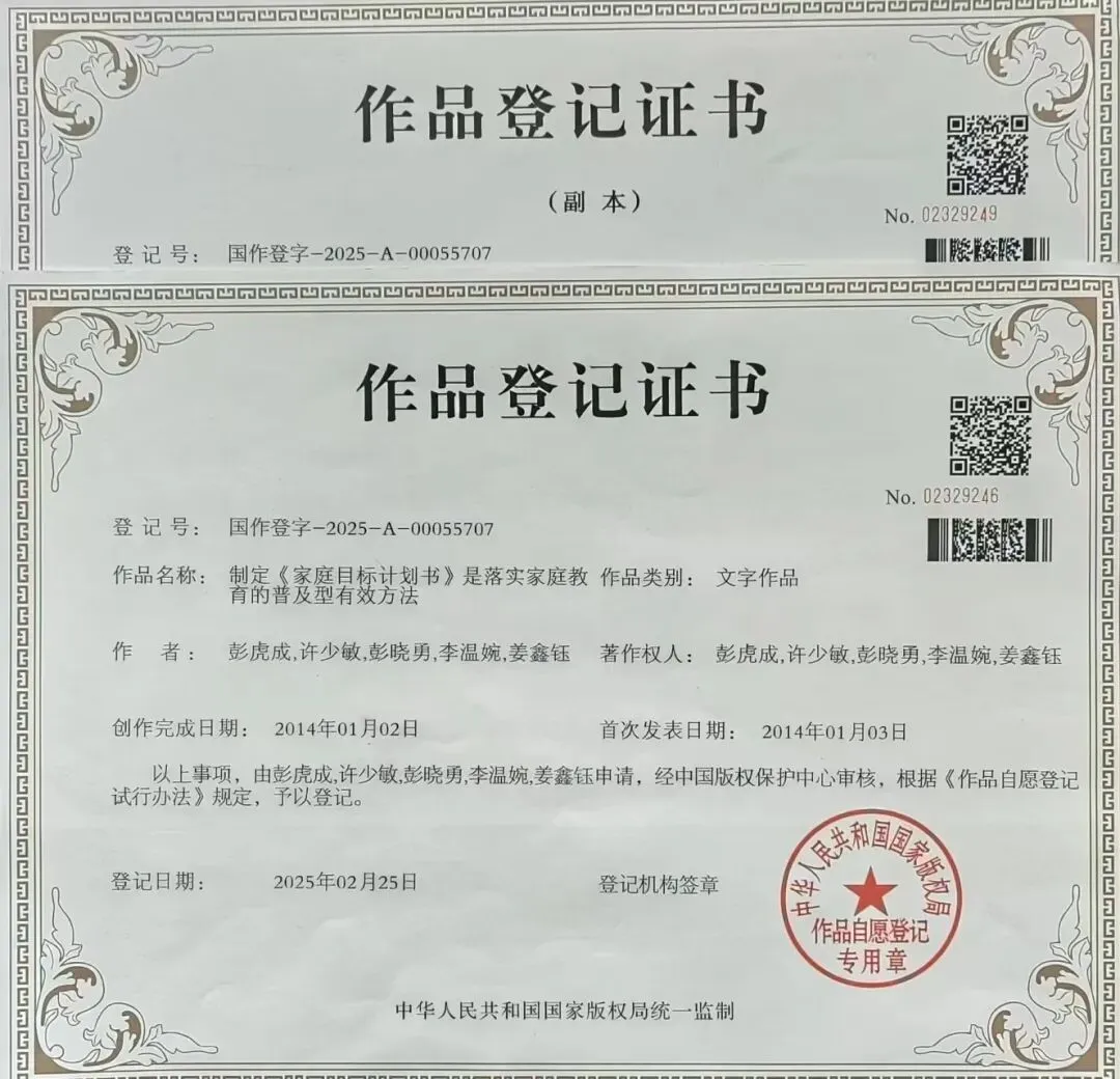 八、2025年3月8日,我们自主研究开发的家庭教育项目一一家庭目标计划书相关内容获批国家知识产权保护登记。