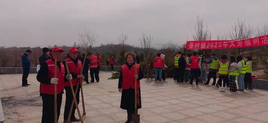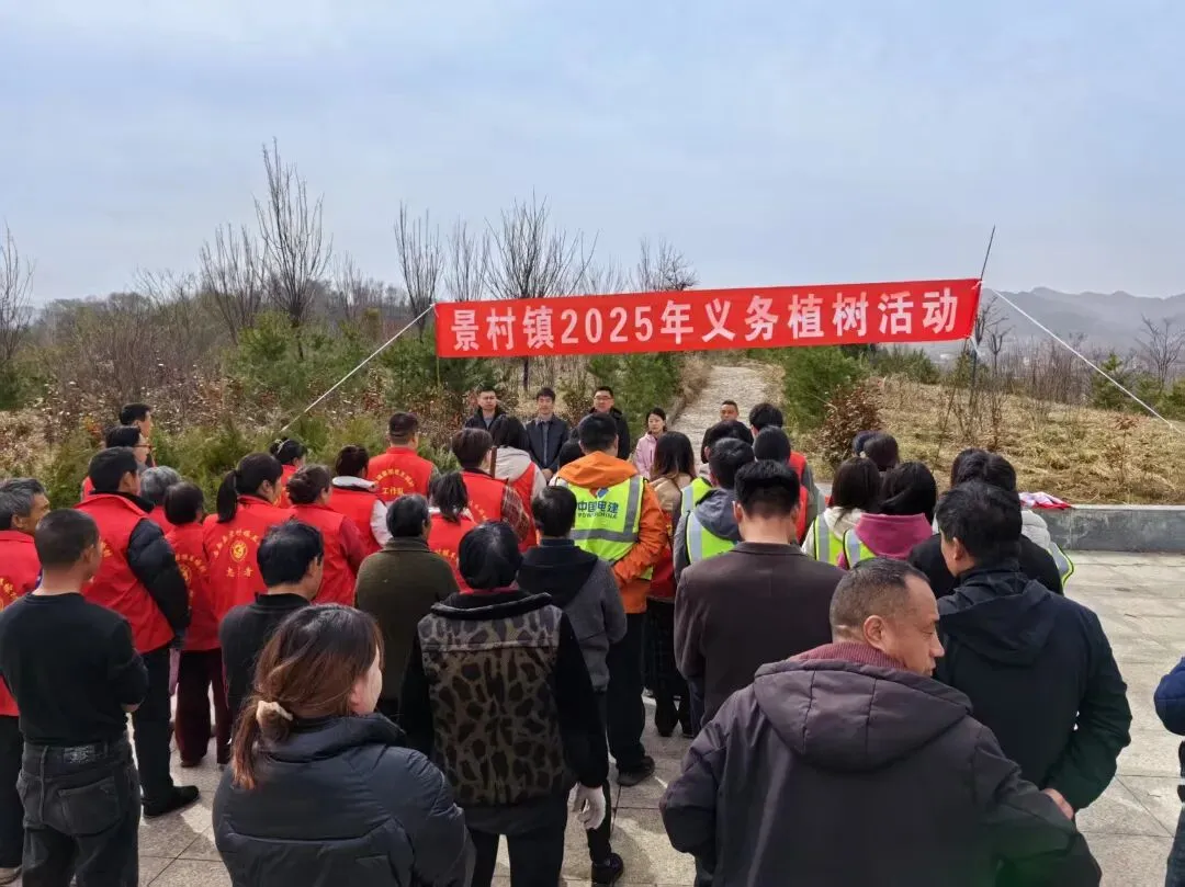 九、2025年3月12日,我们会同西安电力建设工程公司及镇属单位在景村镇红土岭绿化带内种植柏树,约有120名志愿者参加了本次义务植树活动。