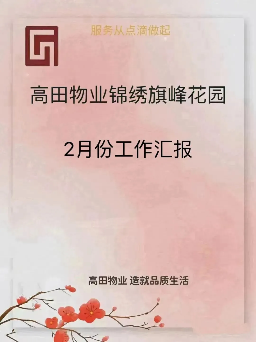 为规范物业服务行为,让您更加深入的了解物业日常工作内容,请查收锦绣旗峰花园2月份工作汇报,欢迎各位业主监督、指正,并提出您的宝贵意见!