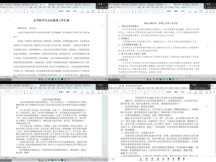 过去一学期,法学院学生会工作扎实推进,成果斐然,亮点纷呈。社会实践方面,学院“三千计划”与各类学科竞赛成果丰硕,斩获国家级、省级奖项多项,展现法科学子出色的创新与实践能力;校园文化方面,迎新晚会、青春诗会、“12·4”晚会、各类体育赛事等活动顺利开展,丰富学生课余生活,营造了积极向上的学院氛围;学生服务与管理方面,完成学生会换届,完善了跨校区工作机制,成绩与综测核算、宿舍管理、奖助学金统计、四六级备考分享、就业指导、考勤查课等常规工作稳步推进,为学生学习与生活提供了坚实保障。