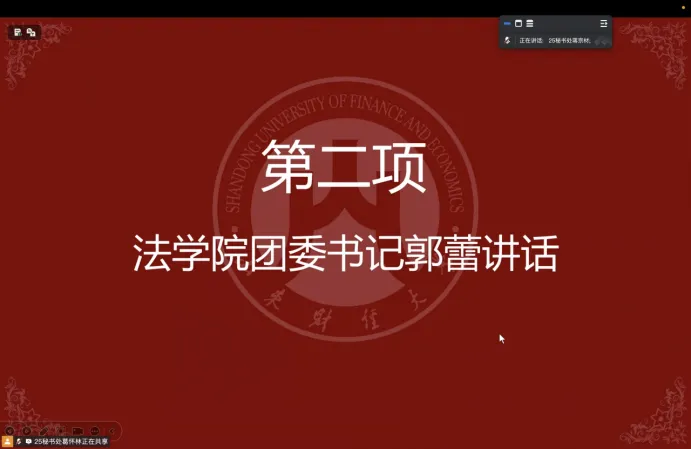 为全面总结法学院学生会上学期的各项工作成效与不足、系统规划新学期重点工作,山东财经大学法学院于3月2日晚线上召开了学生会工作总结会议。会议全面回顾了2025-2026学年第一学期各项工作的开展情况与成果,并对新学期工作作出部署,明确学生会未来发展方向。本次会议由秘书处主持,学生会全体成员参加,学院党委副书记沙林斌、团委书记郭蕾及法学院各级辅导员老师全程参会并做总结指导。