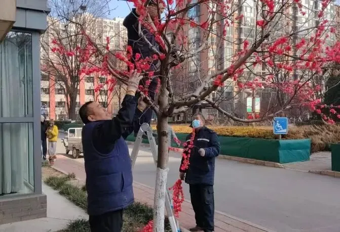 1.春节前园区节日装饰,对园区内树枝绑桃花、大门挂灯笼、大门口安装彩灯、单元大门贴对联、路灯杆上挂灯笼等节日气氛装饰。