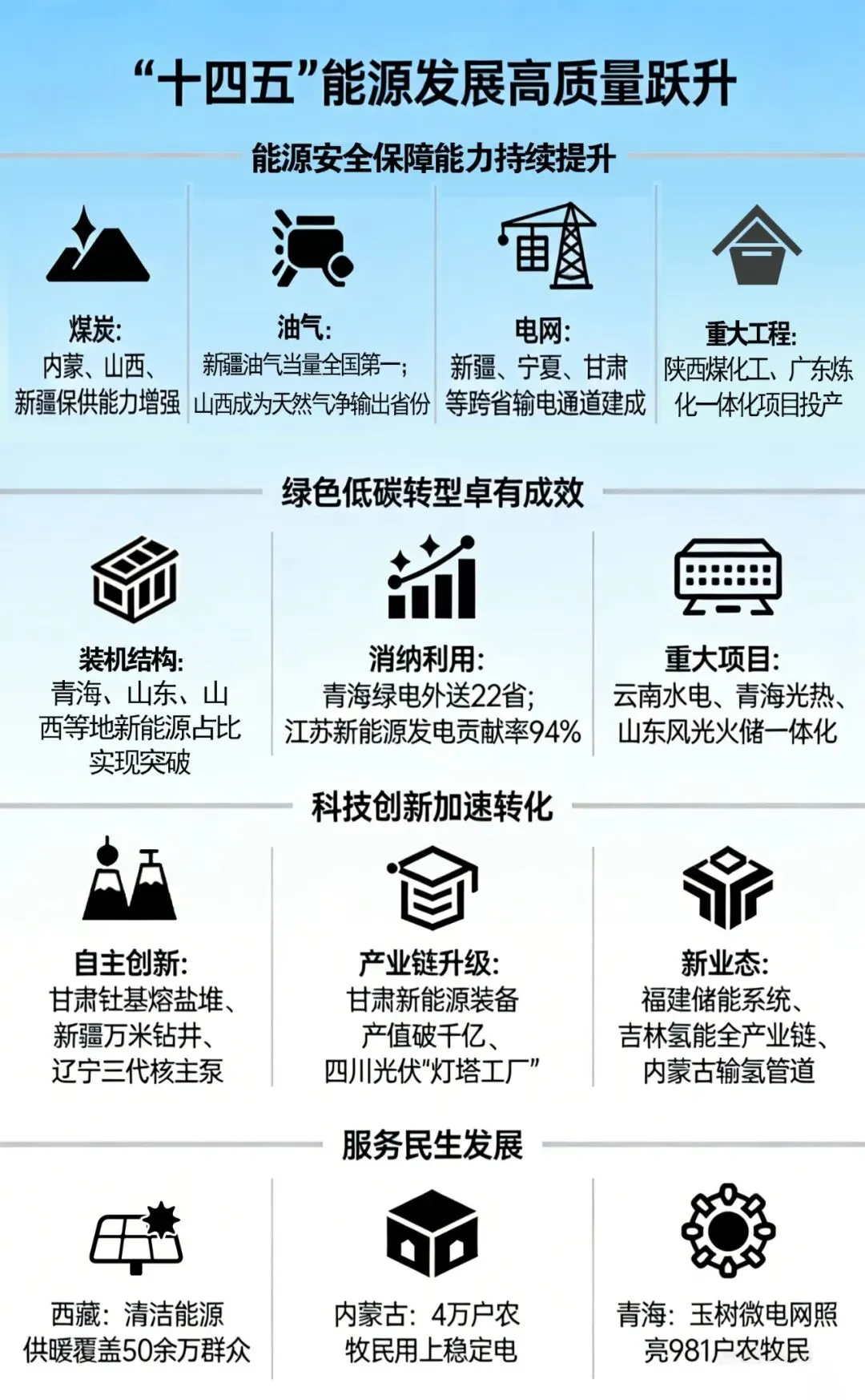 “十四五”时期,我国能源持续加快发展,能源安全保障有力有效,绿色低碳转型步伐不断加快,科技创新水平持续提升,新模式新业态快速发展。