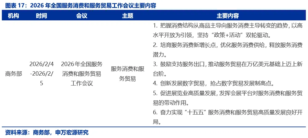 2月4-5日,2026年全国服务消费和服务贸易工作会议在京召开。会议总结2025年及“十四五”工作,研究部署2026年工作,谋划“十五五”服务消费和服务贸易发展。会议指出当前消费结构正从商品消费主导向服务消费主导转变,服务贸易迈上万亿美元新台阶,要以高水平开放为引领,坚持“政策+活动”双轮驱动,培育服务消费新增长点,鼓励支持服务出口,创新发展数字贸易,促进展览业高质量发展,奋力实现“十五五”良好开局。