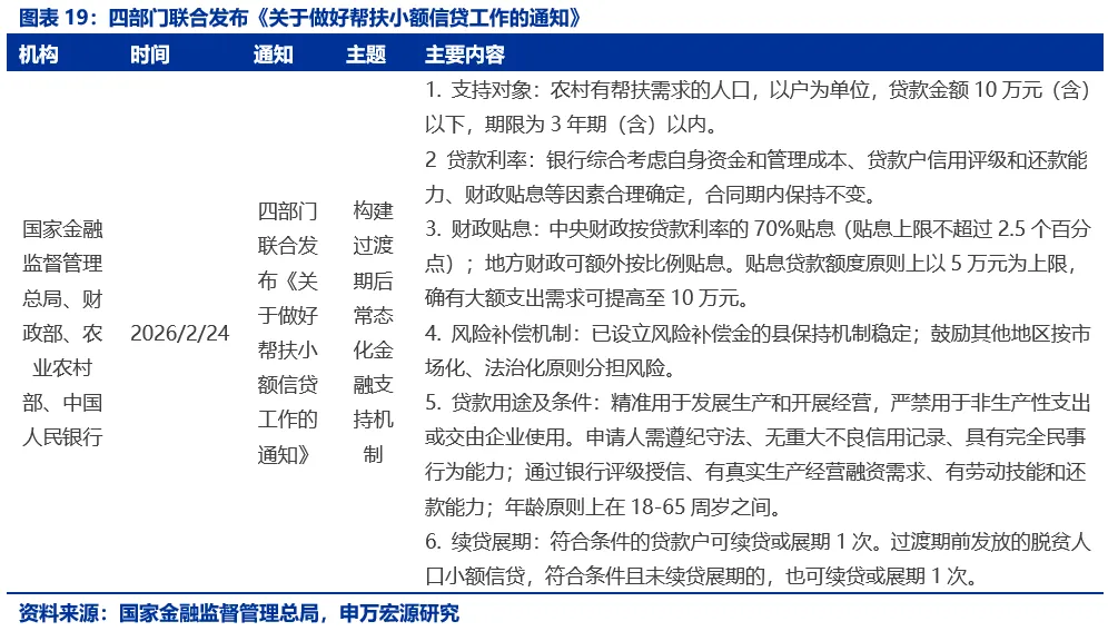2月24日,国家金融监督管理总局、财政部、农业农村部、中国人民银行联合发布《关于做好帮扶小额信贷工作的通知》。此文件在原“脱贫人口小额信贷”基础上调整优化,将支持对象扩展至农村有帮扶需求的人口,单户贷款金额上限提高至10万元,并明确了贷款期限、财政贴息、风险补偿及差异化监管等政策要点,旨在构建过渡期后常态化金融支持机制,助力乡村全面振兴。