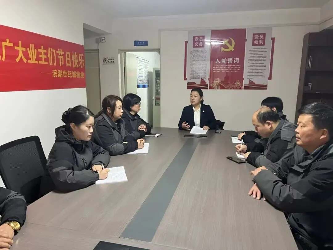 春节期间,世纪金源集团下发关于传达学习黄涛总裁年会讲话《以高质量发展向新而行》的通知。为贯彻落实总裁讲话精神,滨湖世纪城物业复工后第一时间组织全员进行学习。
