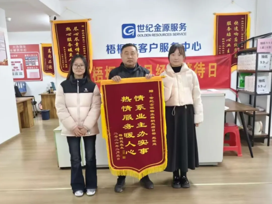 2026年2月7日,梧桐苑业主将一面锦旗送给客服中心主任赵军建,感谢他耐心细致、认真负责,用心解决业主急难愁盼问题,用真诚服务赢得业主认可。