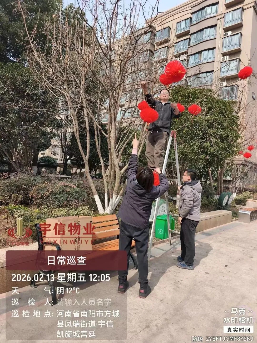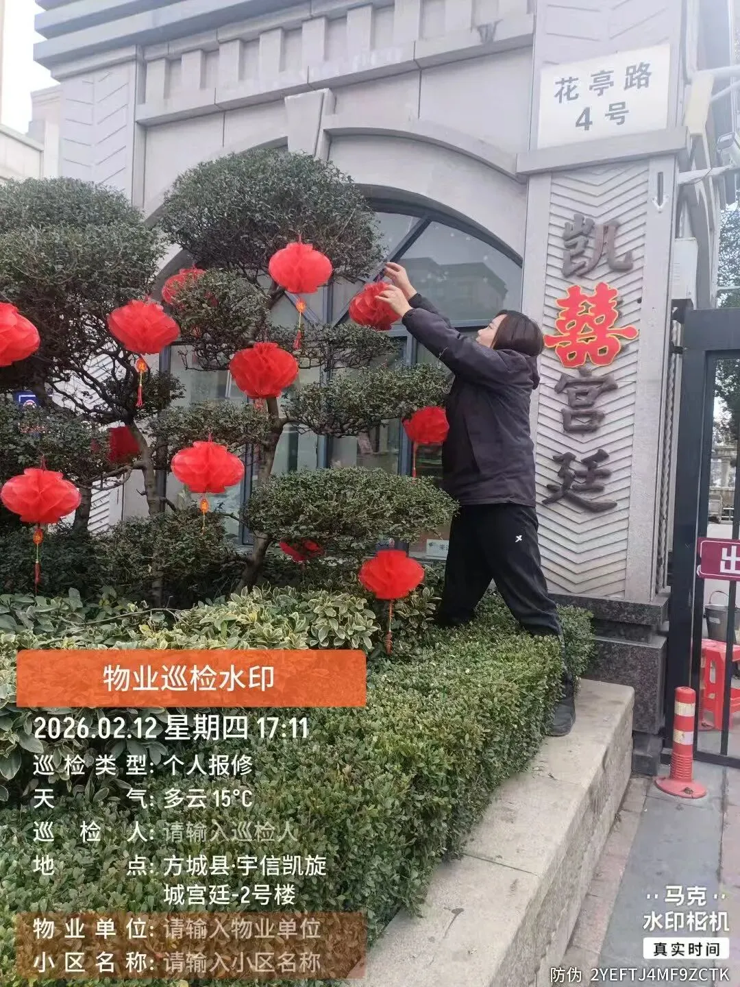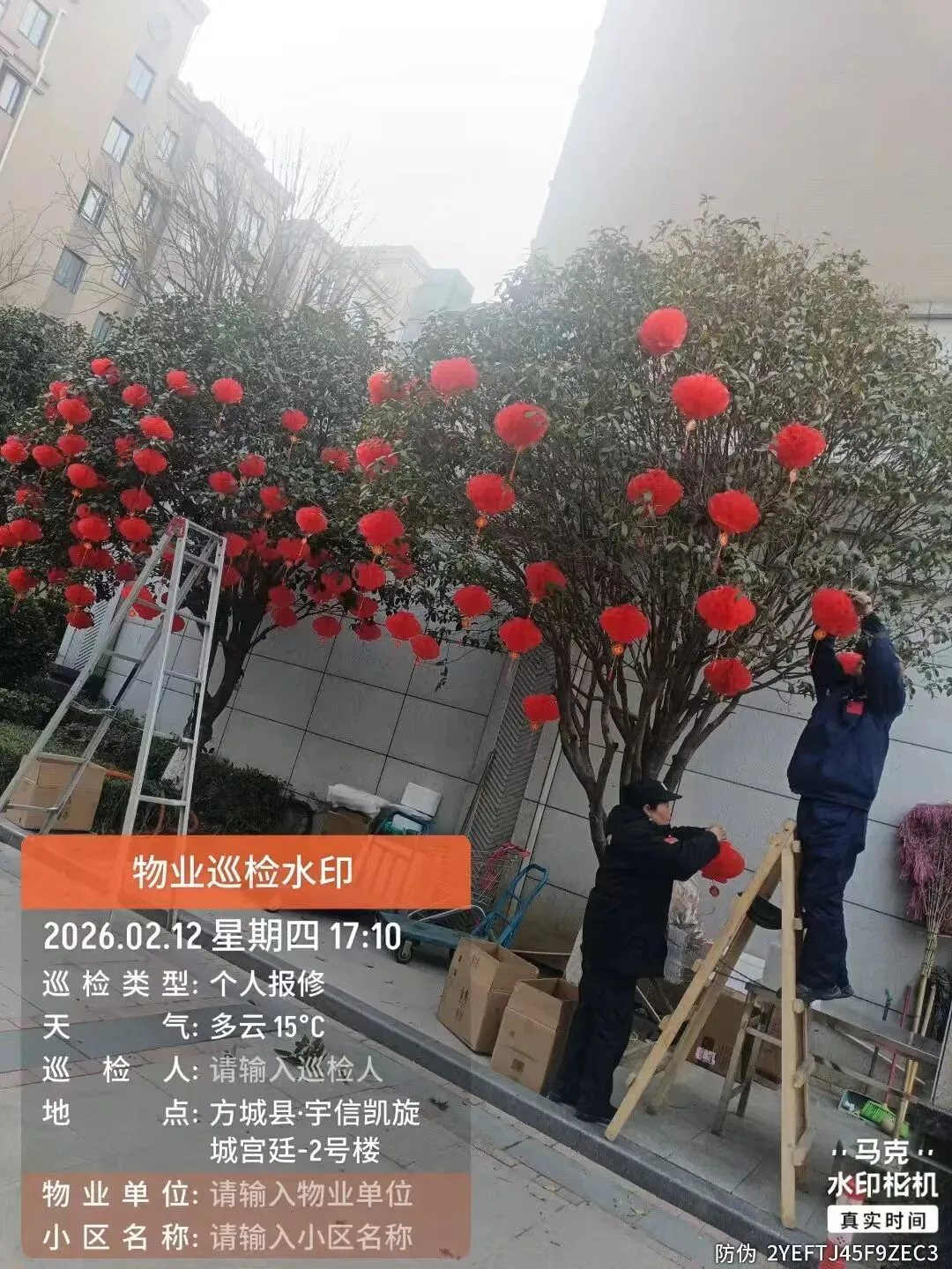 欢声笑语满园区,喜气洋洋,迎新年,灯笼高挂映笑脸,小区装扮换新颜,物业巧手扮家园,只为给您最温馨的幸福家园。